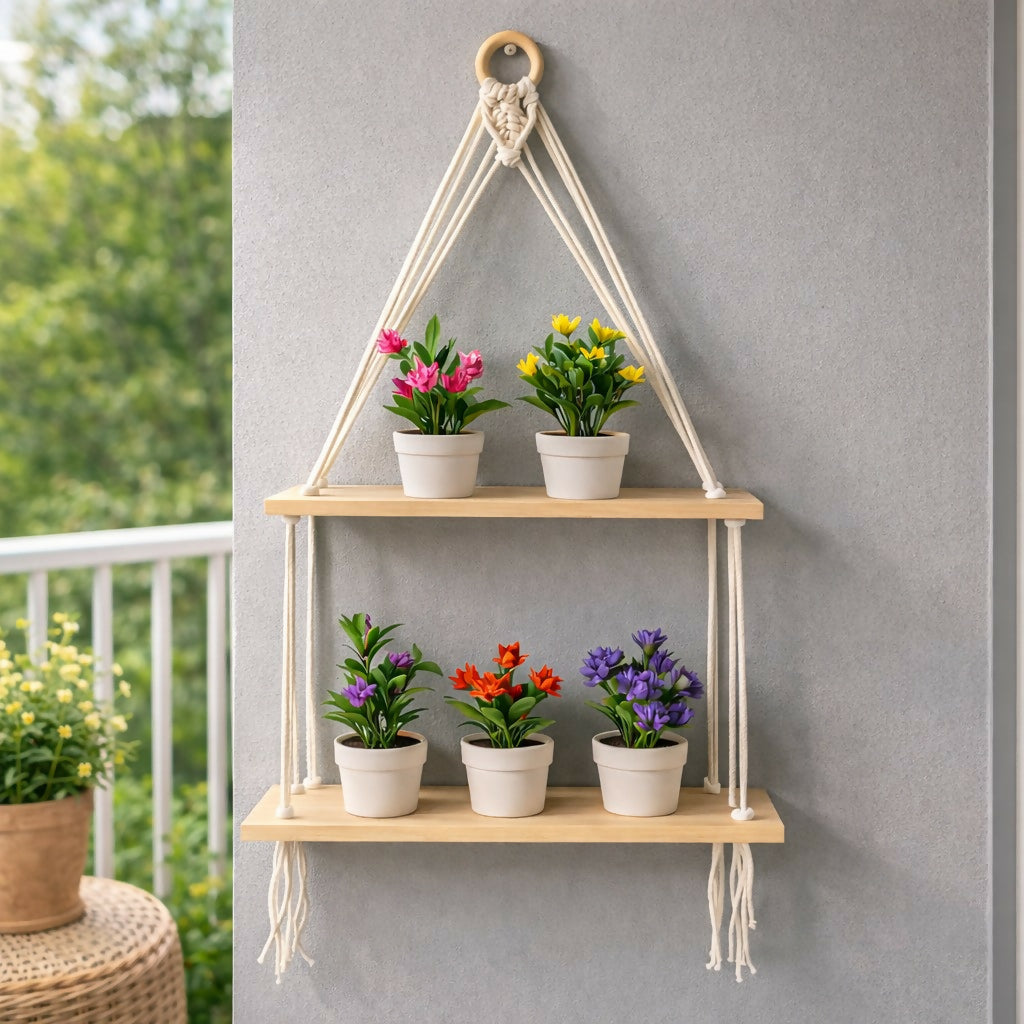 2 Tier Hanging Shelf Design – Dual wooden shelves provide extra display space for décor or plants.