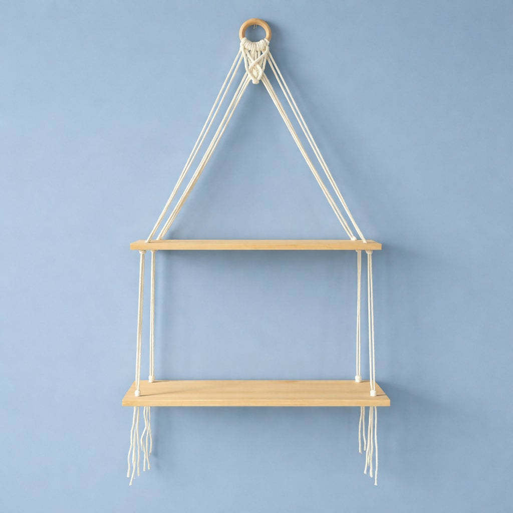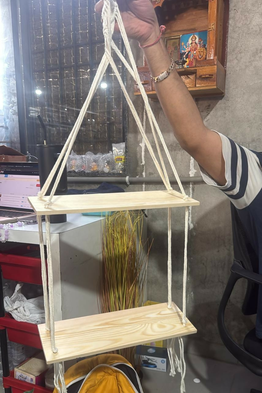 wooden hanging shelf, 2 tier wall shelf, rope hanging shelf, plant display shelf, wall décor shelf, wooden rope shelf, hanging plant shelf, boho wall shelf, decorative wall rack, macrame shelf, wall hanging shelf, wooden display shelf, home décor wall shelf, floating rope shelf, plant stand wall shelf