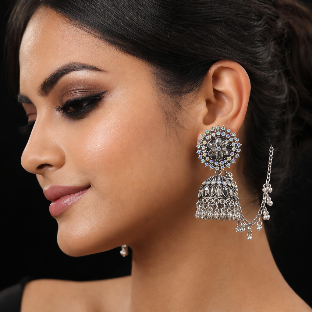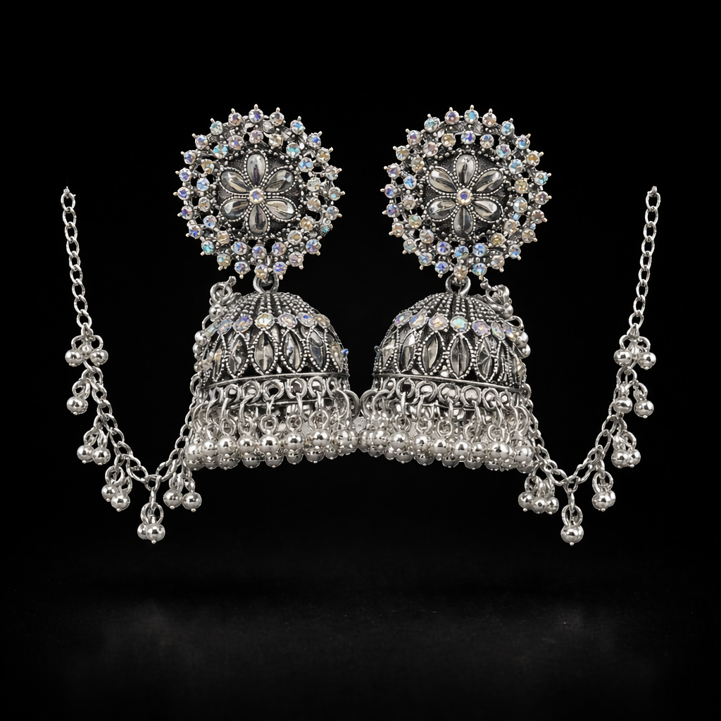 Make a royal statement with these stunning oxidized silver jhumka earrings, beautifully crafted with intricate detailing and sparkling stone embellishments. The floral stud top is adorned with shimmering crystals that enhance its elegant charm, while the dome-shaped jhumka features fine engraved patterns and delicate bead danglings for graceful movement. Attached with stylish side chains for added support and traditional appeal, these earrings are perfect for weddings, festive occasions, and ethnic celebrations. Pair them with sarees, lehengas, or Indo-western outfits to instantly elevate your look with timeless sophistication.