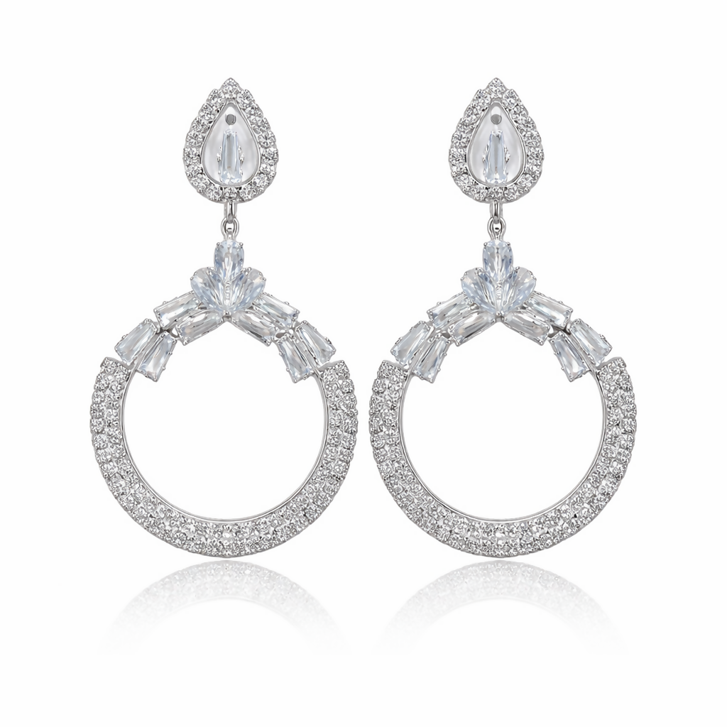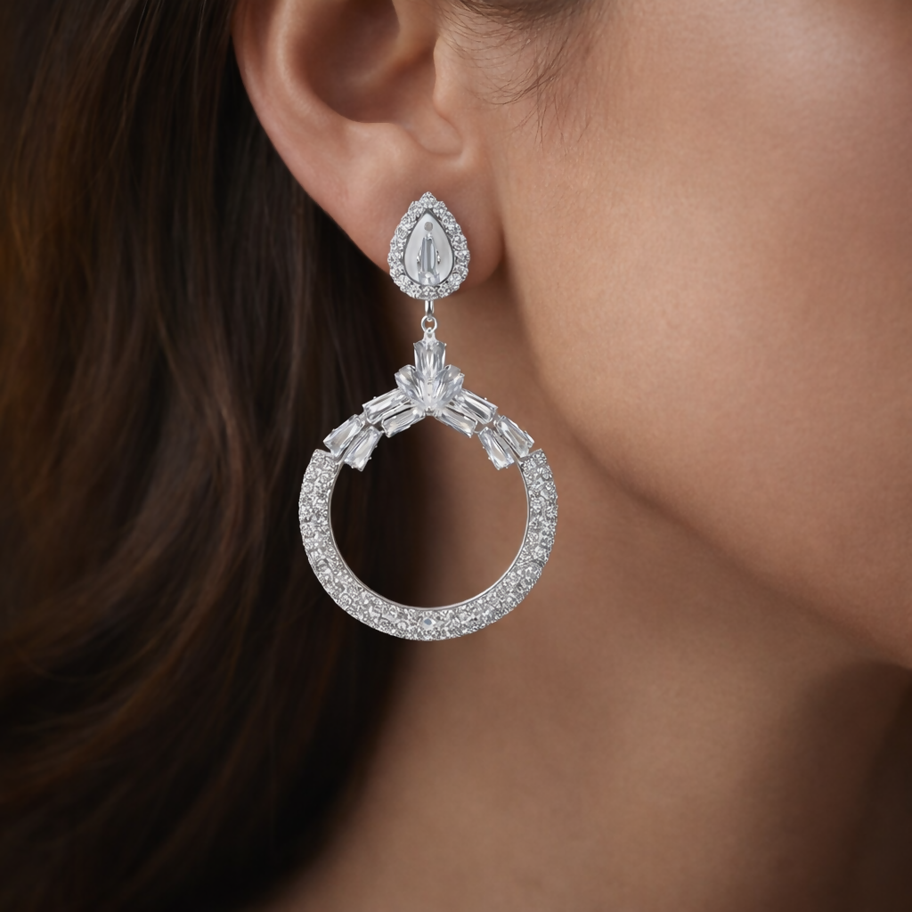 Elevate your elegance with these stunning silver-tone statement earrings, beautifully crafted in a luxurious circular drop design. The top features a delicate teardrop stud surrounded by shimmering stones, leading to a graceful hoop encrusted with fine crystals for maximum sparkle. At the center, a floral-inspired arrangement of baguette and marquise-cut stones adds a touch of sophistication and brilliance. Perfect for weddings, parties, and festive occasions, these glamorous earrings are designed to make you shine effortlessly.
