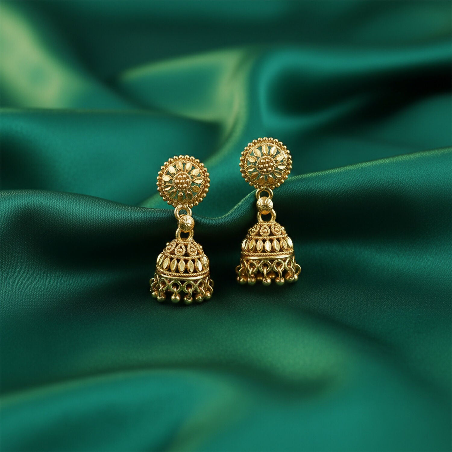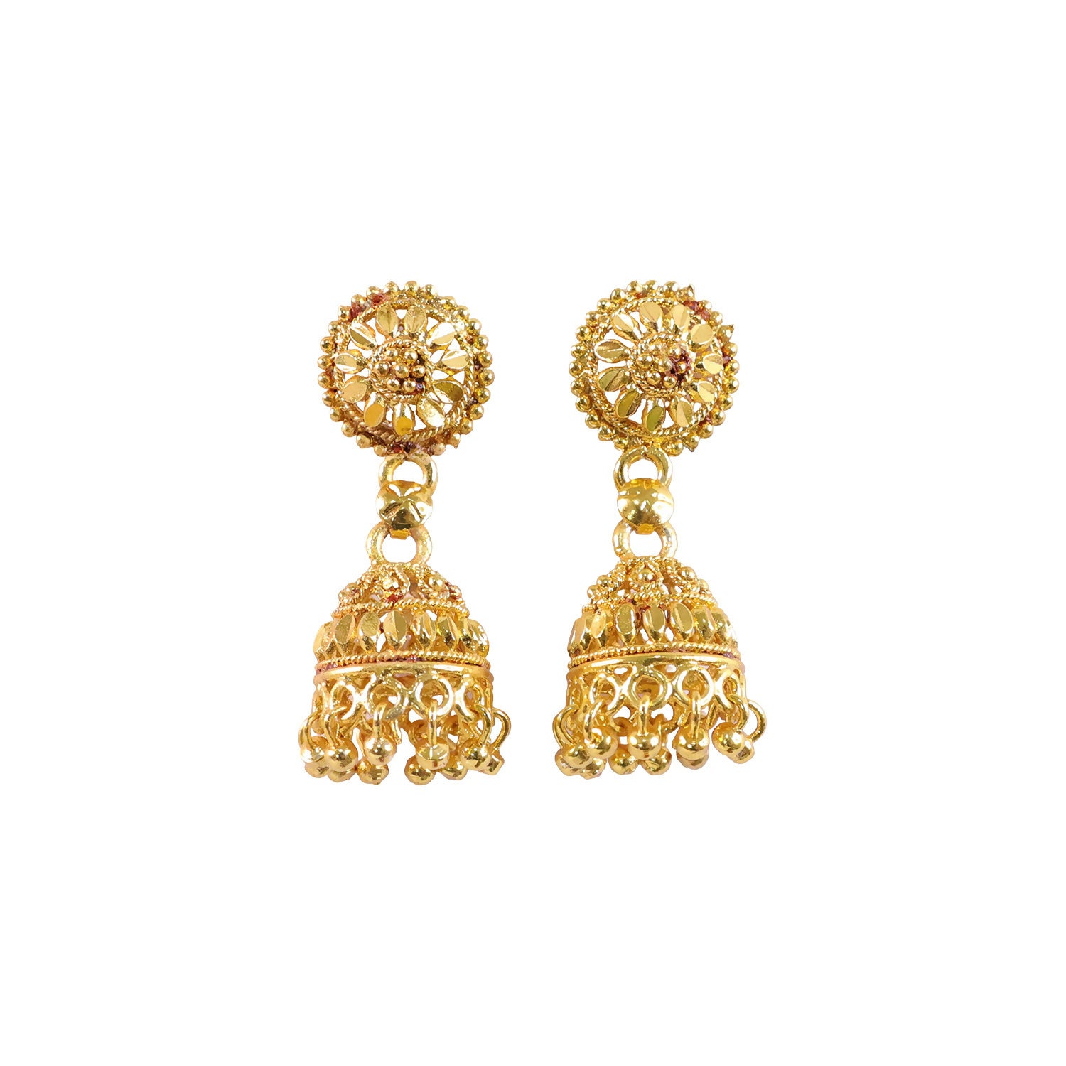 Enhance your ethnic look with these elegant gold plated jhumka earrings designed with intricate traditional detailing. Featuring a beautifully crafted round stud connected to a classic dome-shaped jhumka, the earrings highlight fine patterns and delicate hanging beads that add graceful charm. Their timeless design makes them perfect for pairing with sarees, lehengas, salwar suits, and other traditional outfits. Ideal for weddings, festivals, parties, and special occasions, these earrings bring a sophisticated touch to your overall style. Lightweight and comfortable to wear, they are a perfect accessory for women and girls who love traditional jewelry.