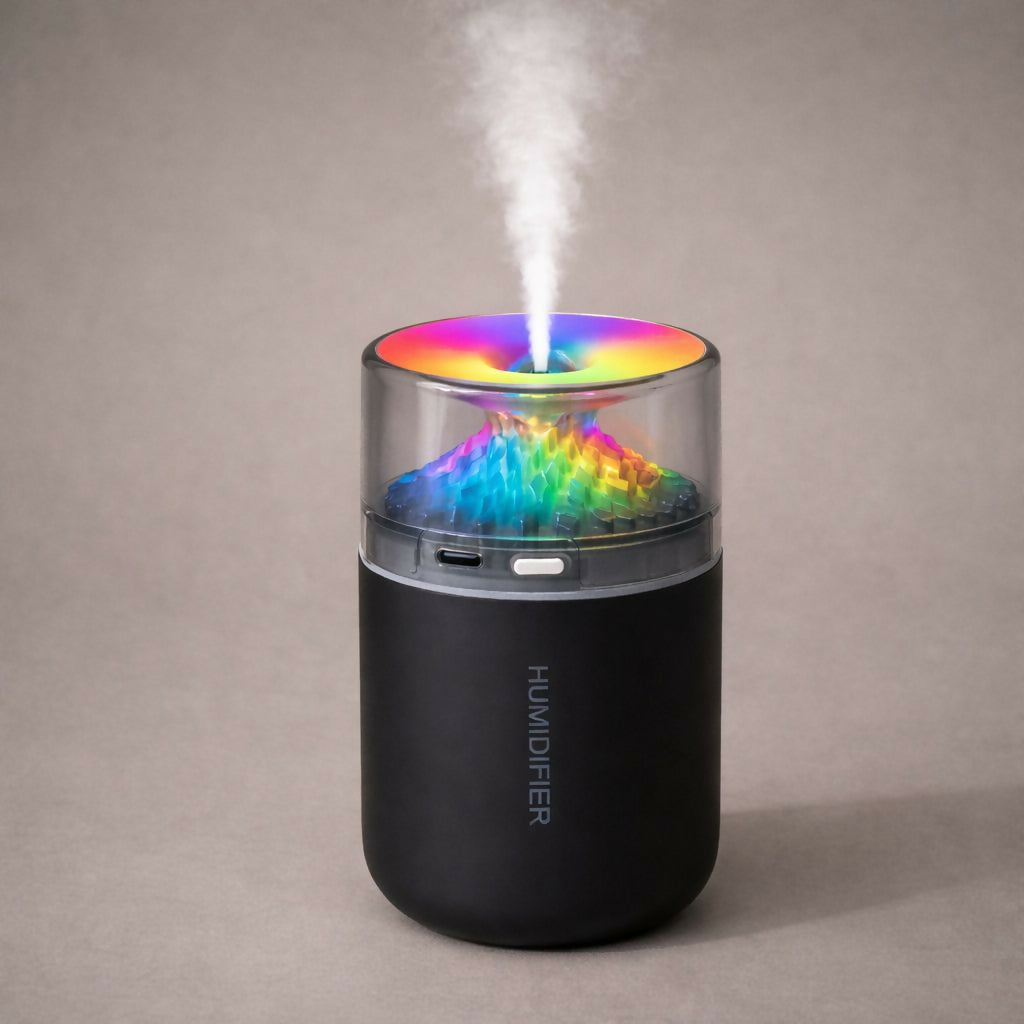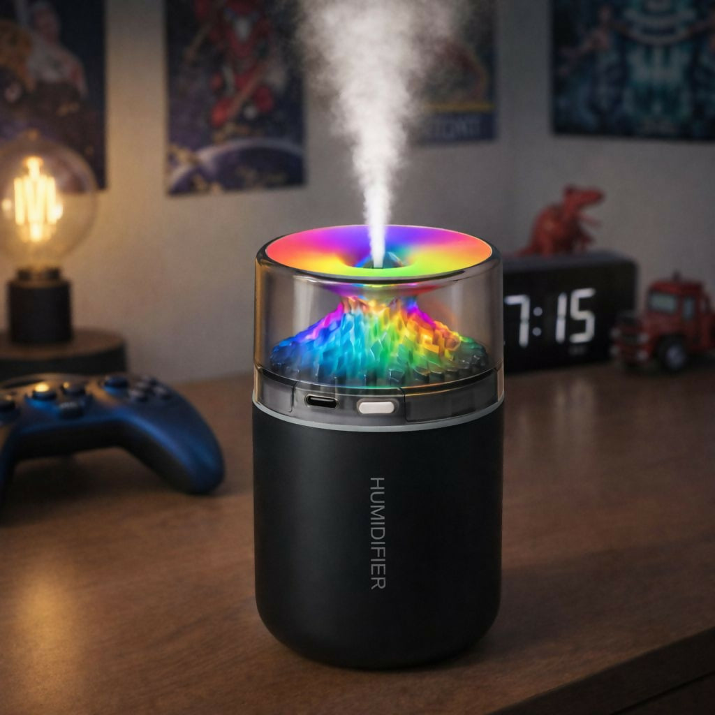 Bring a unique visual experience to your room with this RGB volcano humidifier designed to create a stunning flame-like lighting effect while producing a refreshing mist. The colorful LED lighting combined with the volcano-style design creates a mesmerizing atmosphere, perfect for gaming setups, bedrooms, living rooms, or office desks. This compact humidifier helps maintain comfortable humidity levels while also acting as a decorative ambient light. Powered through USB, it is convenient to use with laptops, power banks, or adapters. Its modern design makes it both a functional humidifier and an eye-catching decorative piece.