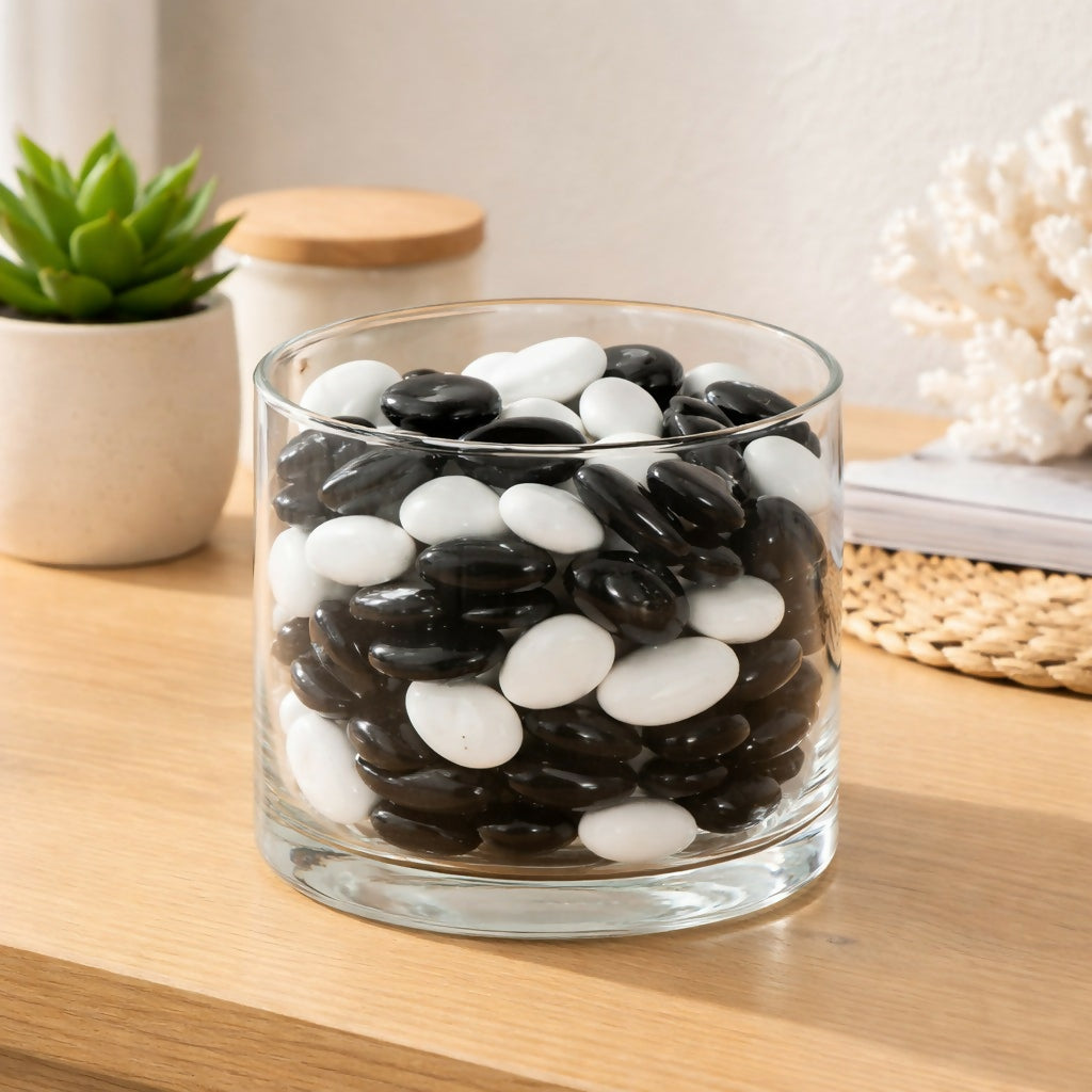 Enhance your indoor and outdoor décor with these smooth black and white decorative pebbles. Perfect for plant pots, water fountains, aquariums, vases, and garden landscaping, these polished stones add a modern and elegant touch to any space. Their smooth finish and natural look make them ideal for home décor projects, DIY crafts, and terrarium decoration. Packed in a convenient mesh bag for easy storage and use.