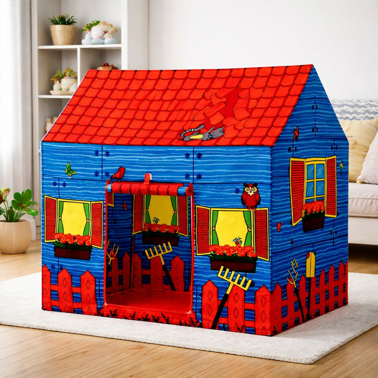Turn playtime into an exciting home adventure with this Blue & Red Kids Play Tent House. Designed with a colorful cottage-style print, bright roof pattern, and playful outdoor-themed graphics, it creates a fun and engaging space for children to explore their imagination. The vibrant detailing adds charm and makes it an attractive addition to any play area.