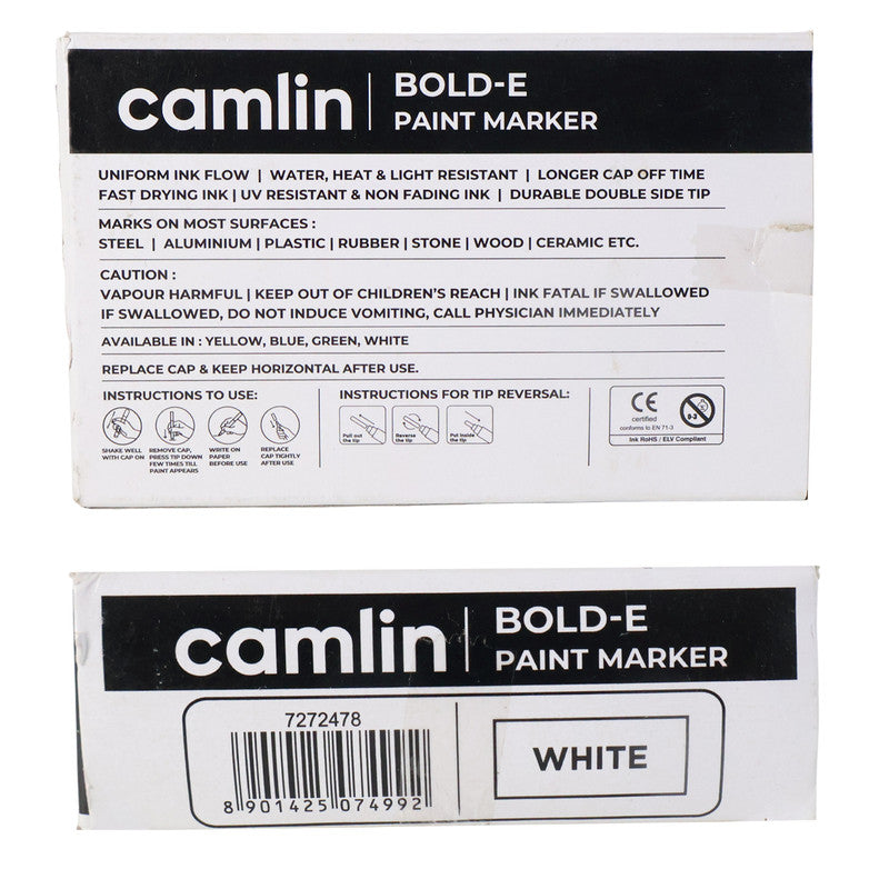 The Camlin Bold-E Paint Marker White Pack of 10 is designed for bold, opaque, and permanent marking on smooth and rough surfaces, making it highly useful for industrial, professional, and creative applications. With its vibrant white ink, this marker delivers high visibility on dark and coloured surfaces such as metal, glass, plastic, wood, ceramic, cardboard, and stone. The refillable design ensures long-lasting use while reducing waste, and the durable fiber tip provides consistent ink flow with smooth application. Quick-drying, smudge-proof, and water-resistant, these markers are ideal for heavy-duty marking, signage, labeling, and creative projects where strong visibility and permanence are essential.
