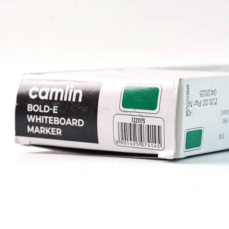 The Camlin Bold-E Whiteboard Marker in Green color is a high-quality writing tool designed for smooth, bold, and visible markings on whiteboards. This pack of 10 refillable markers ensures long-lasting performance, making it ideal for schools, offices, coaching centers, and professional presentations. The quick-drying ink provides crisp and clear writing that is easy to erase without leaving stains or ghost marks, while the specially designed tip ensures consistent ink flow and bold visibility. With refillable convenience, these markers are eco-friendly and cost-effective, reducing the need for frequent replacements. Whether used for teaching, brainstorming, planning sessions, or creative illustrations, the Camlin Bold-E Whiteboard Markers deliver reliability, durability, and professional-quality results every time.