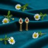 Elevate your ethnic wardrobe with these exquisitely crafted Gold-Plated Jhumka Earrings, featuring intricate filigree work and a classic bell-shaped drop. The ornate circular studs are accented with vibrant green and blue enamel touches, adding a regal pop of color to the traditional design. Finished with delicate golden beads that offer a graceful sway, these lightweight yet stunning earrings are the perfect statement piece for weddings, festivals, and special celebrations.