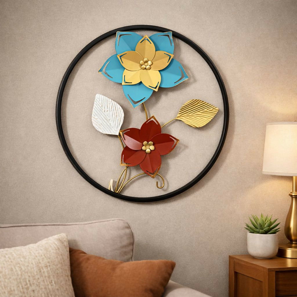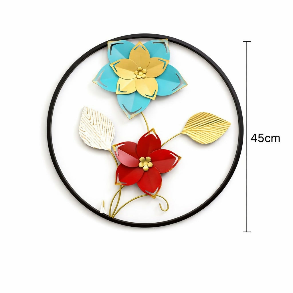 Add a vibrant and elegant touch to your walls with this beautiful metal floral wall art décor. Designed with colorful flowers and artistic leaves inside a modern circular frame, this decorative wall hanging brings a perfect blend of contemporary style and nature-inspired design. The combination of blue, red, gold, and neutral tones creates a striking visual accent that enhances the beauty of living rooms, bedrooms, hallways, or office spaces. Crafted with detailed metalwork, this wall décor piece acts as a stylish statement element that complements modern and classic interiors. It also makes a thoughtful gift for housewarmings, weddings, and festive celebrations.