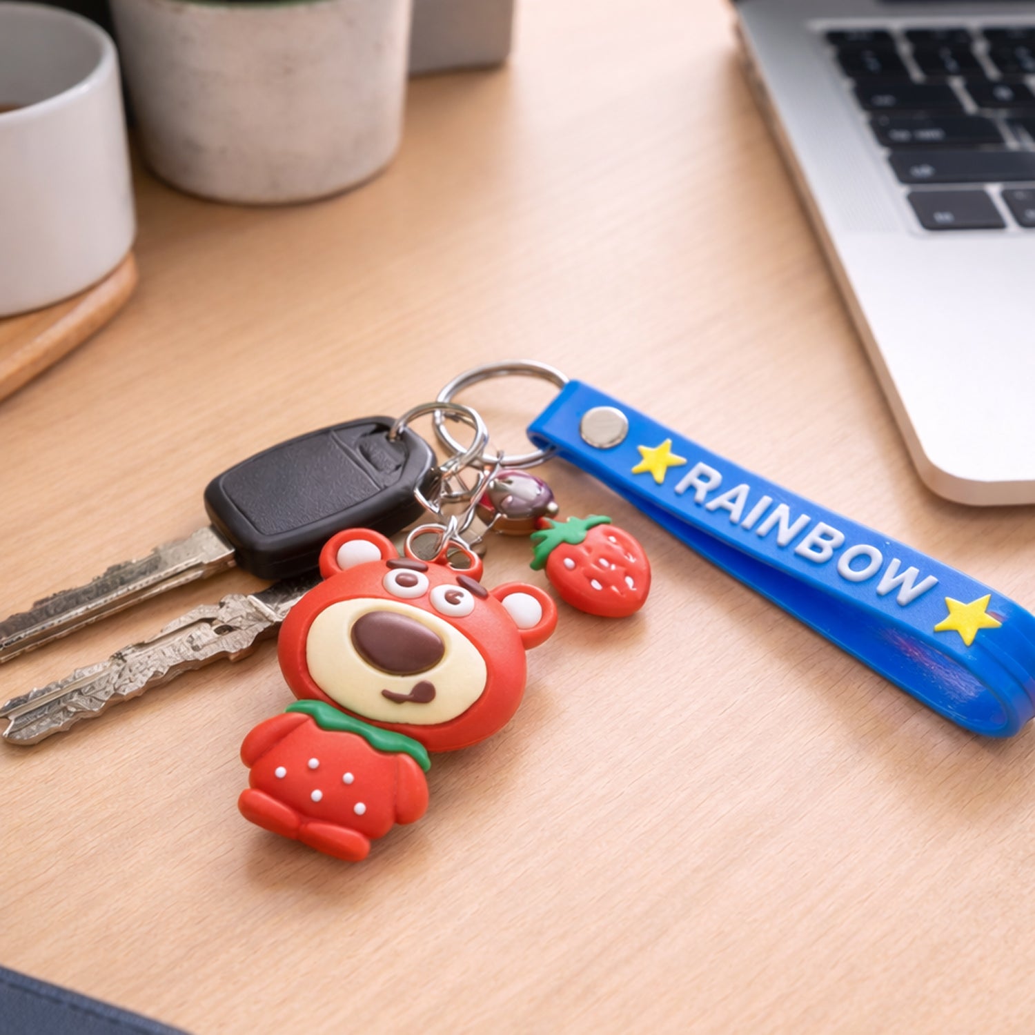 Add a touch of fun and color to your daily essentials with this adorable teddy bear keychain featuring a vibrant rainbow wrist strap and cute strawberry charm. Designed with a soft cartoon-style character, this key ring makes a charming accessory for school bags, handbags, pencil pouches and keys. The sturdy strap ensures a comfortable grip and easy carrying, while the secure key ring keeps your keys safely attached. Its playful design makes it a favorite among kids and teenagers. Perfect for gifting or personal use, this keychain adds personality to everyday items.