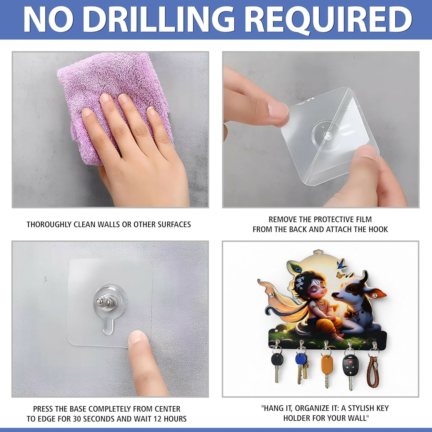 This decorative wall key holder features a beautifully illustrated Krishna design with vibrant detailing, adding a spiritual and artistic touch to your entrance or living space. Designed with multiple sturdy hooks, it helps organize keys, keychains, and small accessories neatly in one place. The no-drilling installation makes it easy to mount using adhesive support, keeping your walls damage-free. Ideal for homes, offices, hotels, hostels, and shops, it combines functionality with elegant wall décor. A perfect blend of organization and style for modern and traditional interiors.