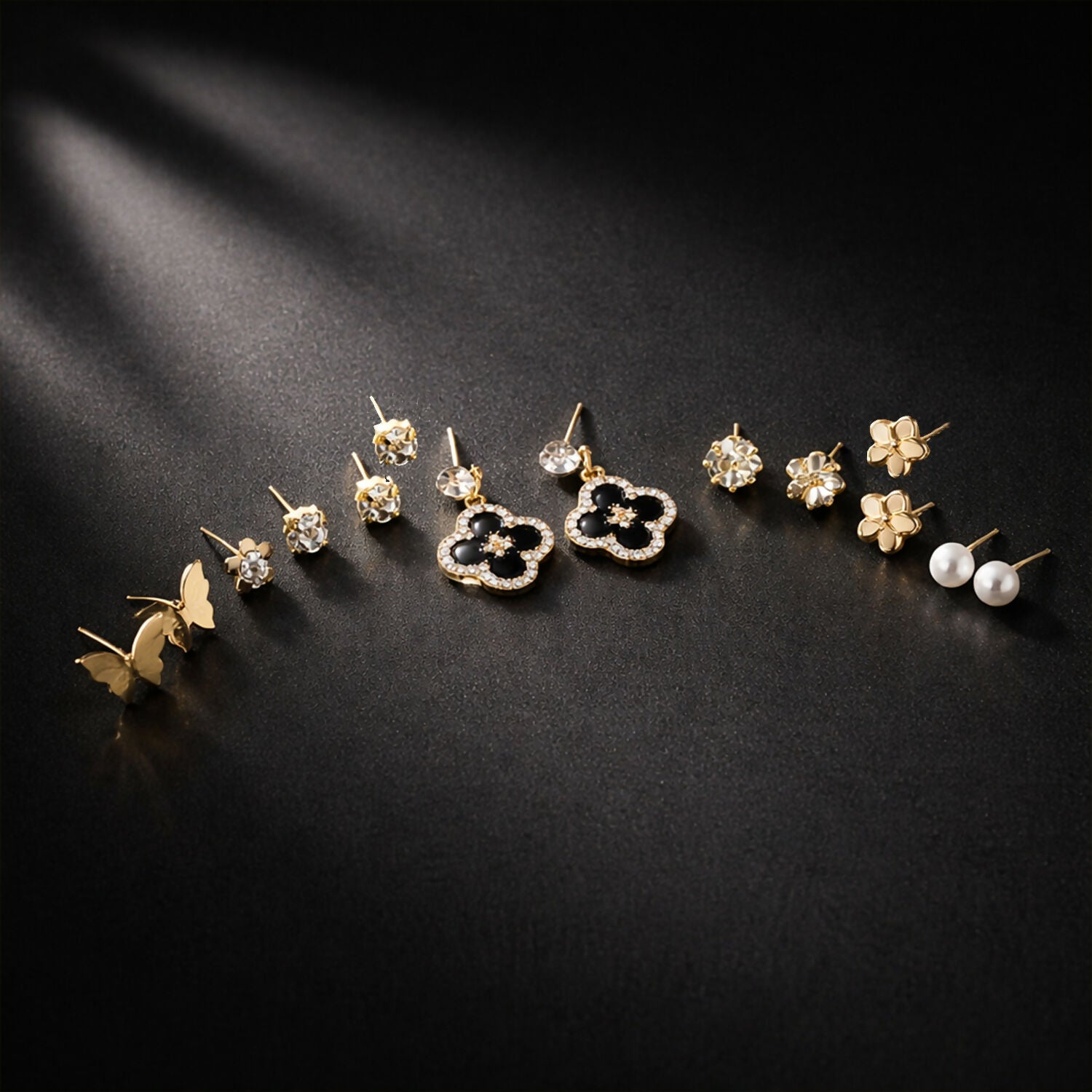 Enhance your style with this Elegant Combo Earrings Set for Women, designed to offer multiple trendy options in one beautiful set. This combo includes a mix of black floral drop earrings, gold bow studs, pearl studs, and crystal flower studs, making it perfect for every occasion and outfit.