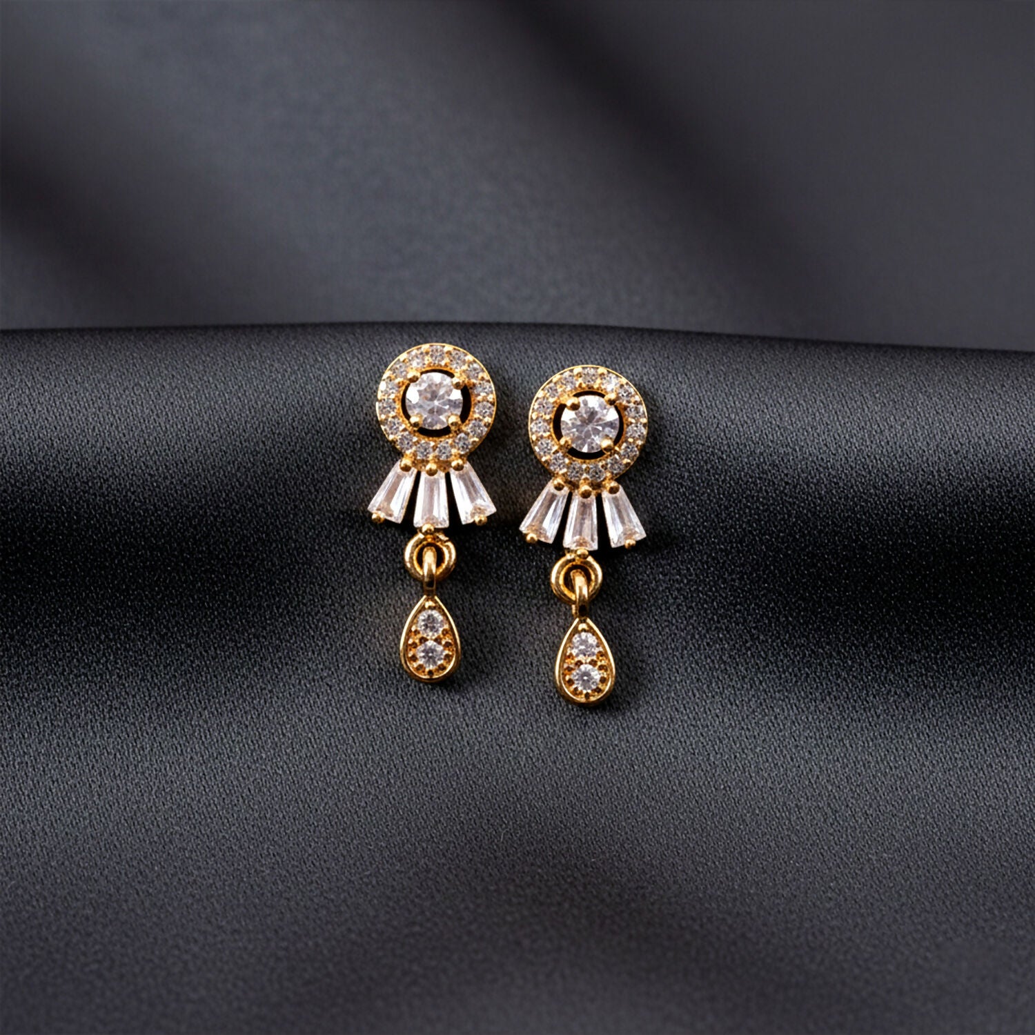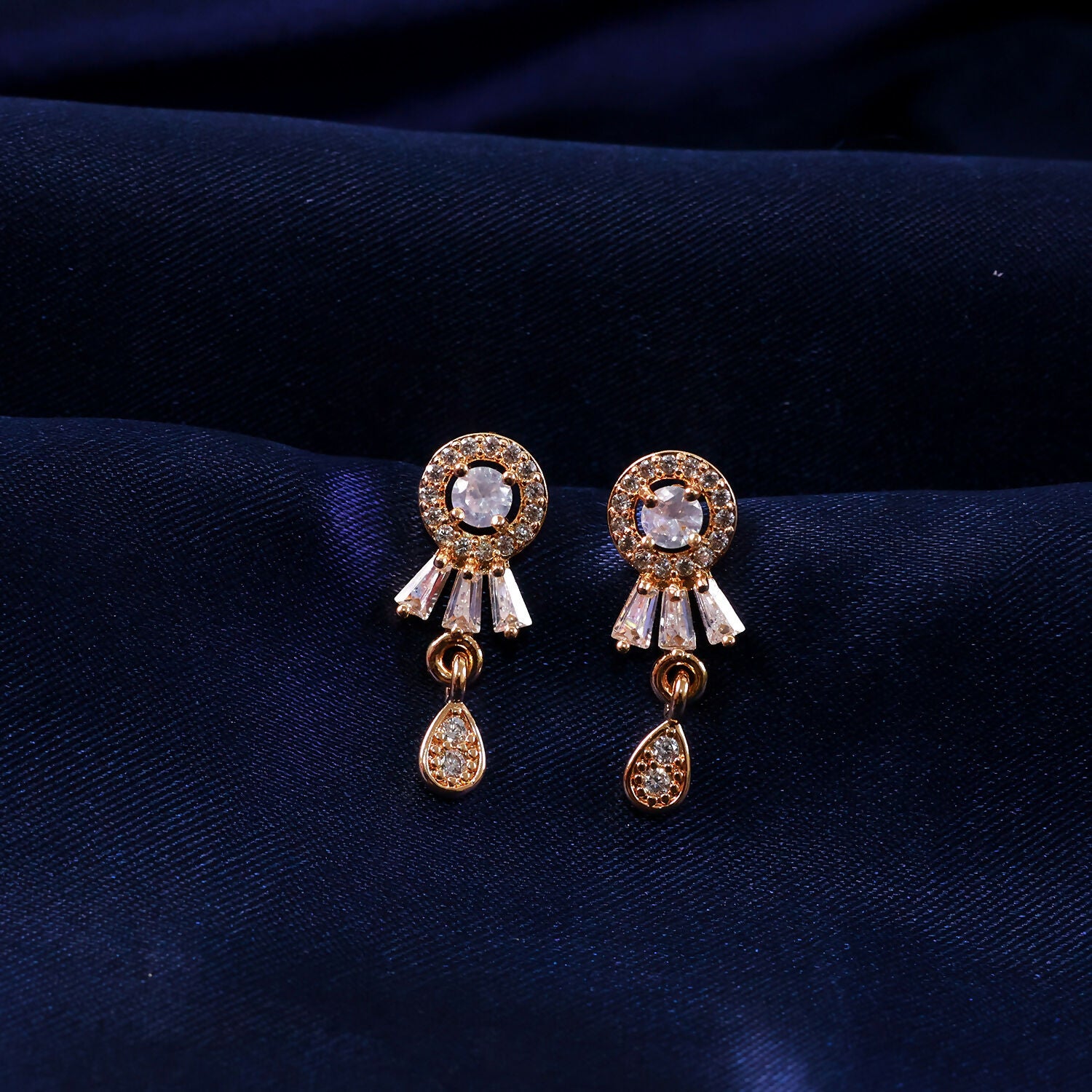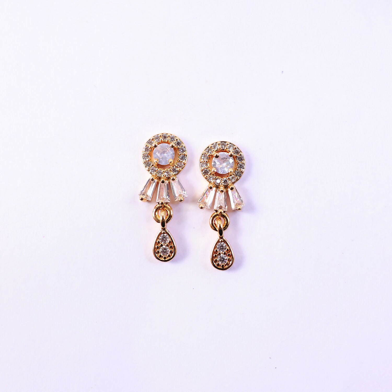 These elegant stud drop earrings feature a classic round CZ stone design with a delicate hanging drop that adds graceful movement. The gold-plated finish gives a rich and polished look, making them suitable for both everyday wear and special occasions. The sparkling CZ stones enhance the overall appearance without being too heavy or flashy. Lightweight and comfortable, these earrings pair beautifully with ethnic as well as western outfits. A perfect choice for women who prefer subtle yet stylish jewellery.