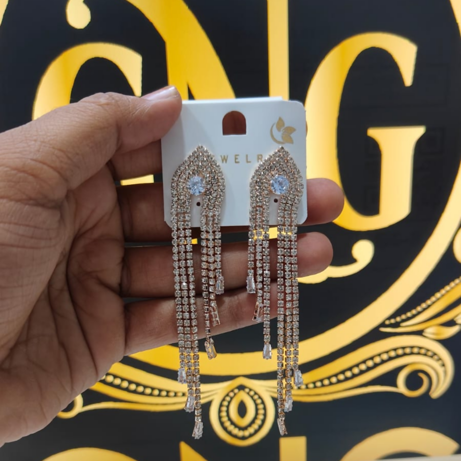 Elevate your style with these luxurious rose gold chandelier earrings, beautifully designed with a teardrop-shaped top encrusted in shimmering cubic zirconia. The cascading strands of sparkling stones and delicate baguette crystal drops create a graceful, flowing silhouette that catches the light from every angle. Perfect for evening parties, weddings, and special occasions, these statement earrings add a bold yet elegant touch to any outfit.