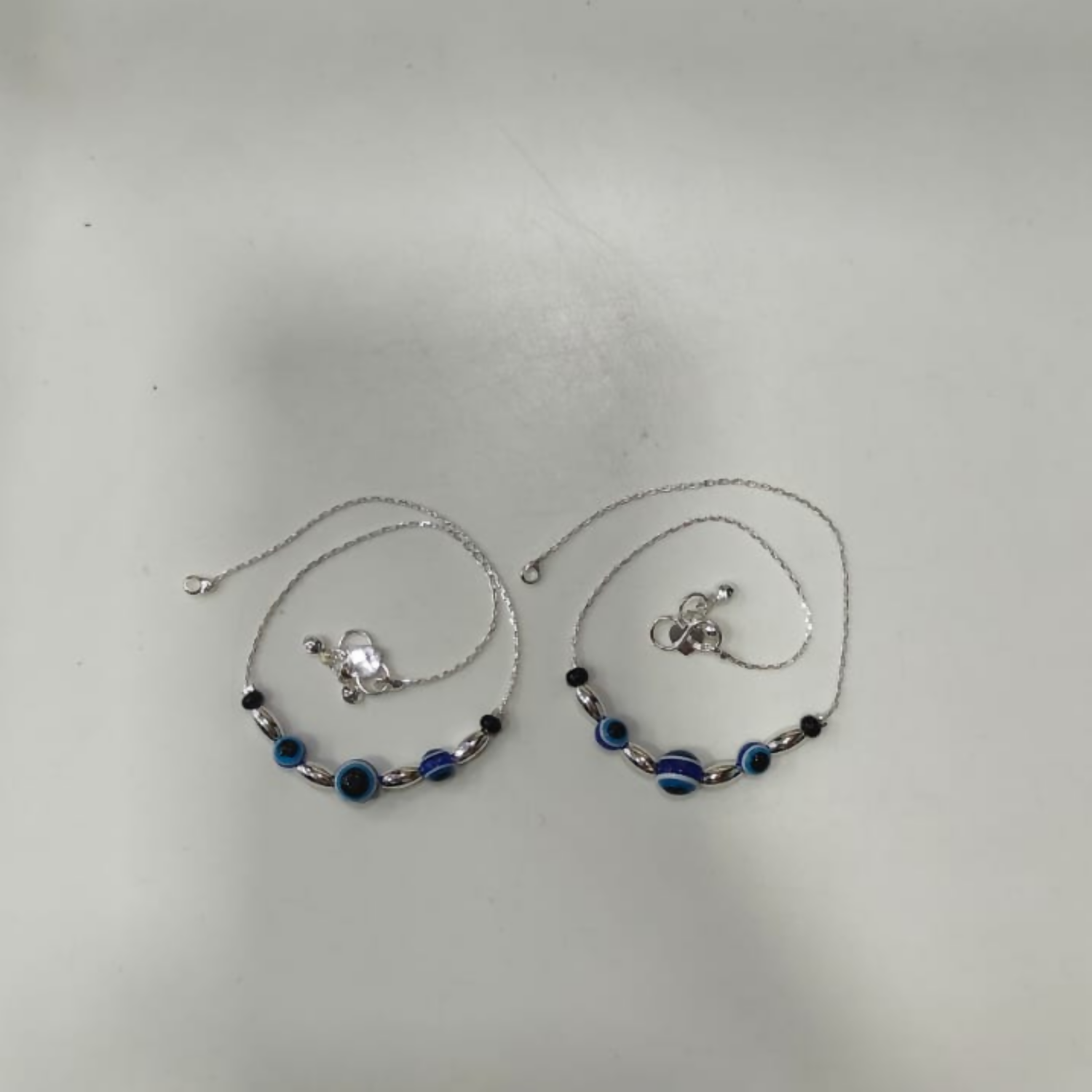 Elegant and eye-catching silver-tone anklet pair designed with beautiful blue evil-eye beads and polished metallic accents. The delicate chain combined with stylish beads creates a modern yet traditional look, making it perfect for daily wear as well as festive occasions. Lightweight, comfortable, and crafted with fine detailing, this anklet adds a graceful charm to your feet and pairs beautifully with both ethnic and western outfits. A perfect accessory to enhance your style or a lovely gift option. ✨