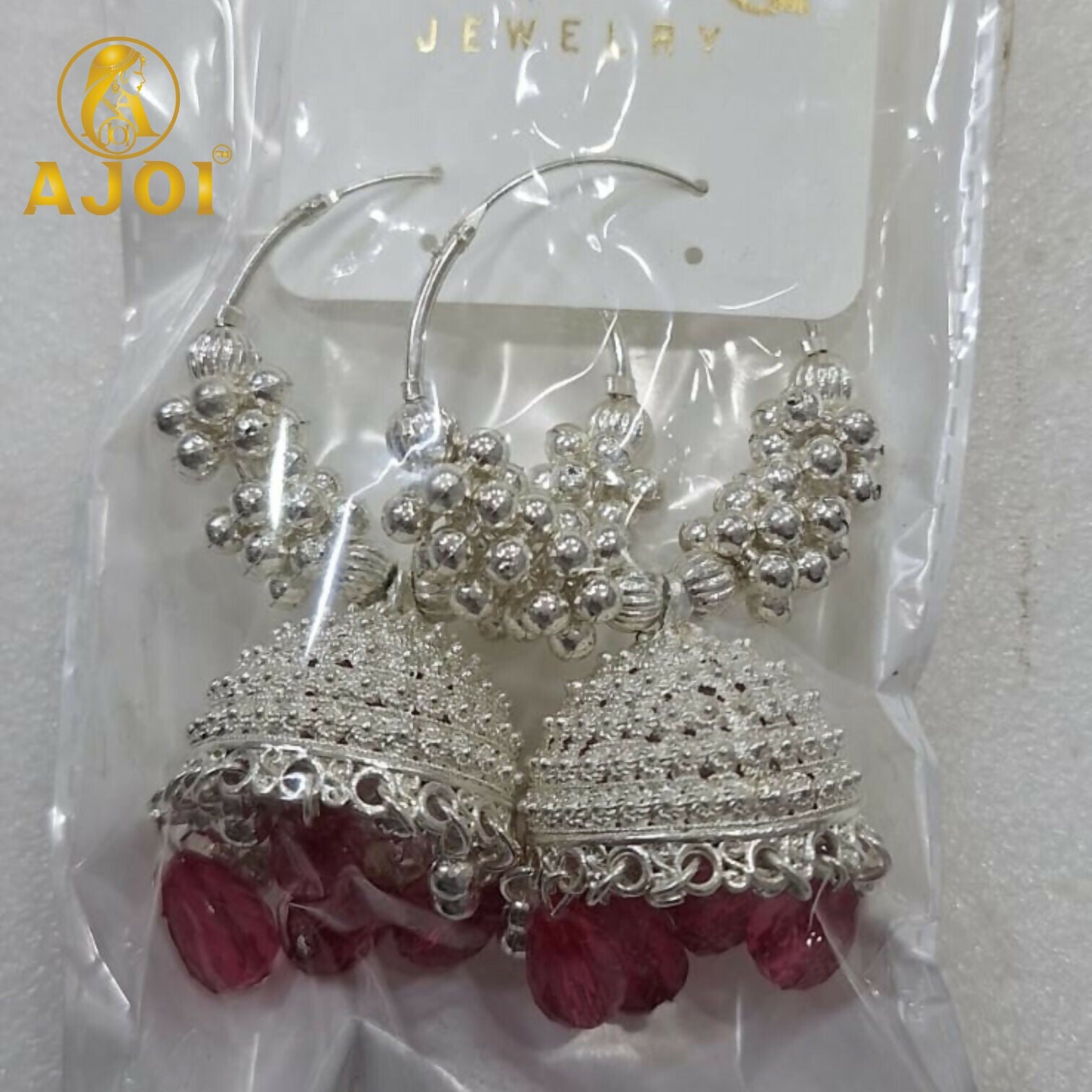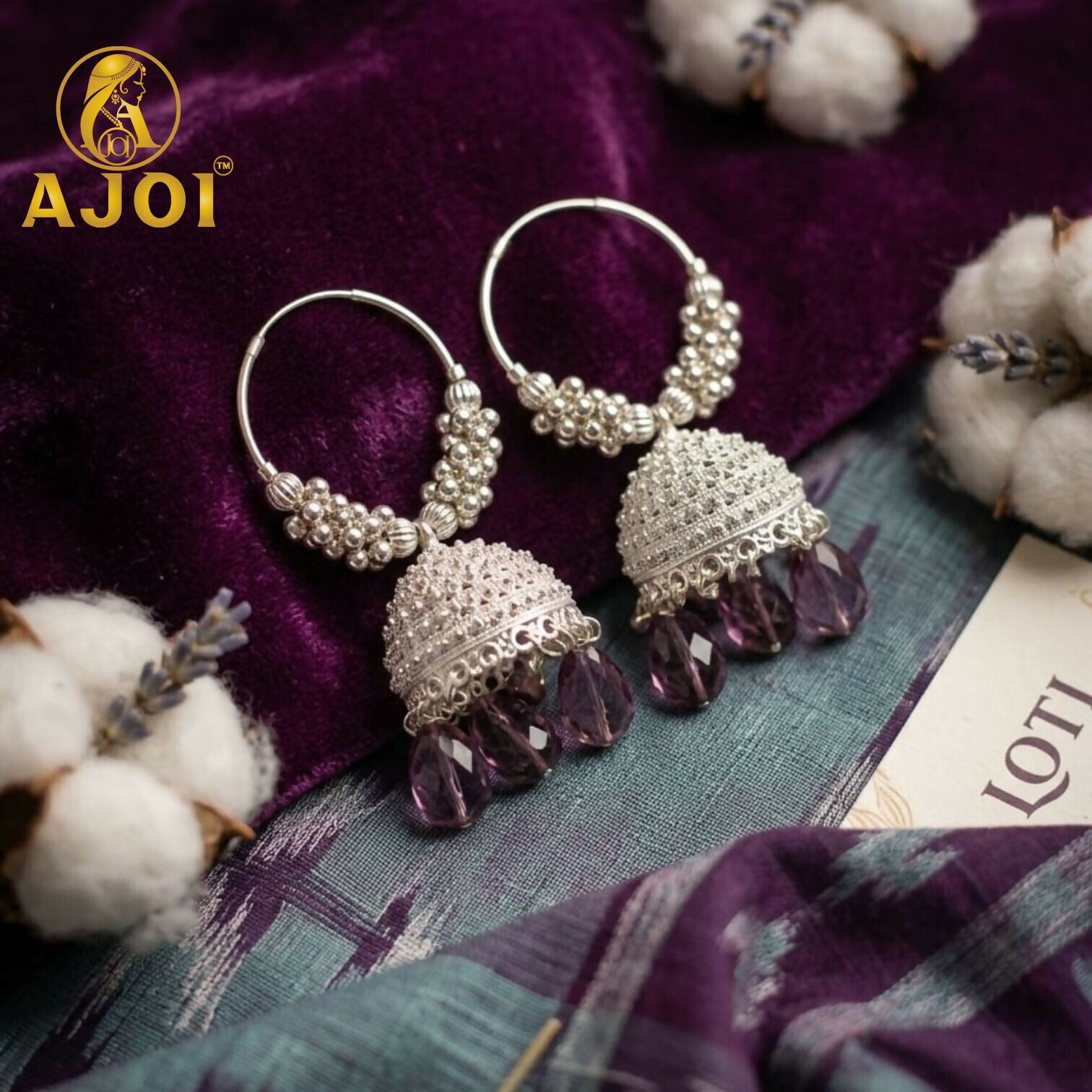 Make a graceful statement with these finely handcrafted silver jhumka hoop earrings. Featuring intricate floral bead clusters and a beautifully textured dome, the design is enhanced with rich emerald-green drop beads for a regal finish. A timeless blend of tradition and sophistication, perfect for festive celebrations and wedding occasions.