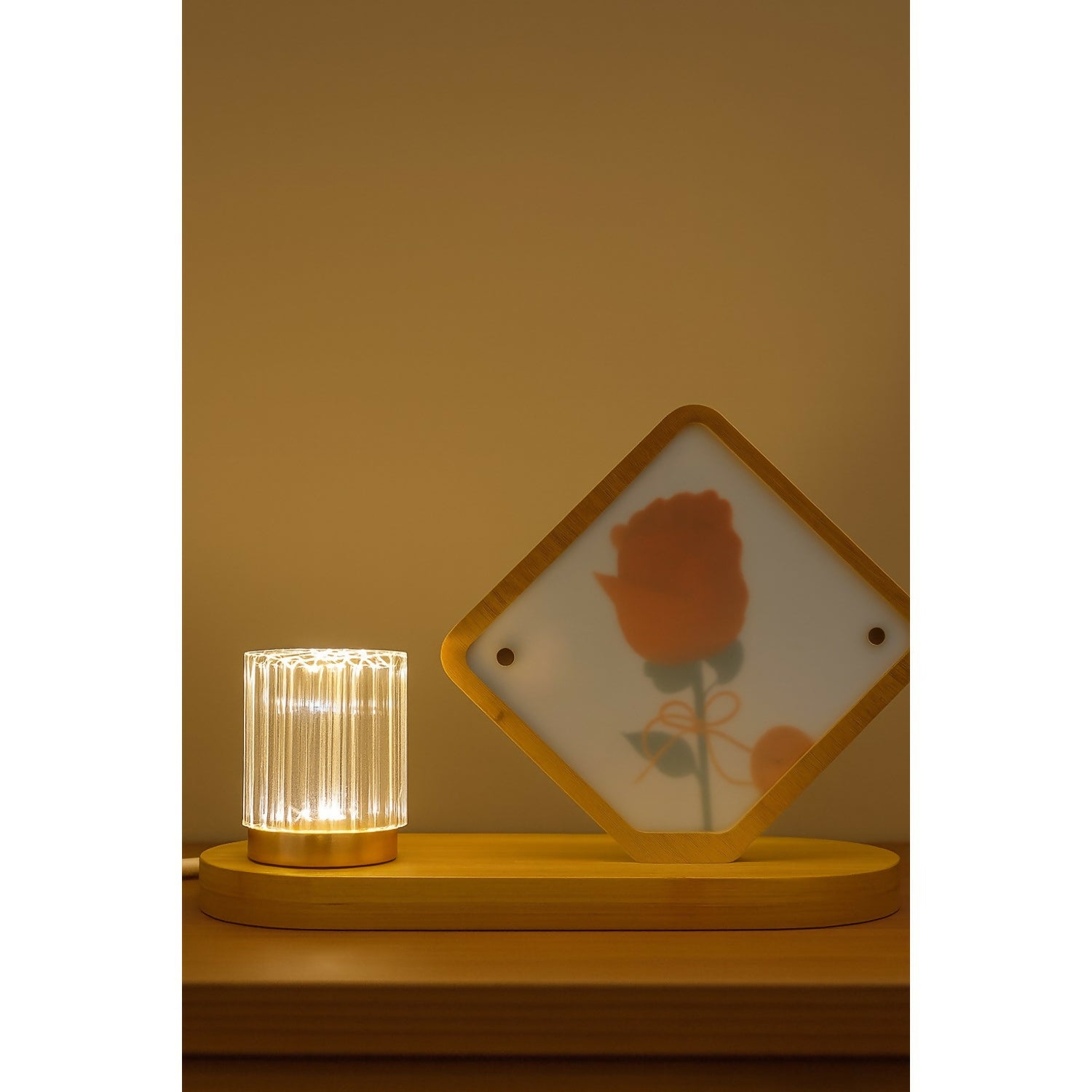 wooden frame night lamp, rose night light, romantic bedside lamp, USB powered table lamp, LED decorative lamp, ambient lighting for bedroom, wooden home decor lamp, crystal dome LED light, luxury bedside lighting, cozy night light gift, aesthetic table décor, modern home lighting, couple gift lamp, romantic mood light, warm glow night lamp
