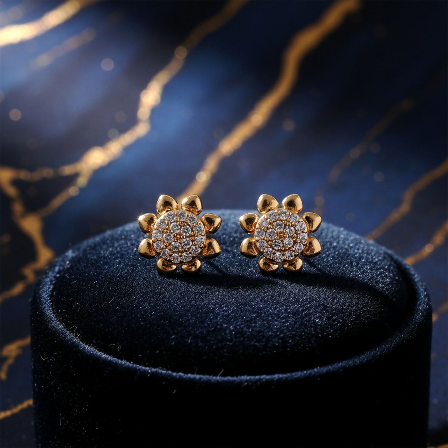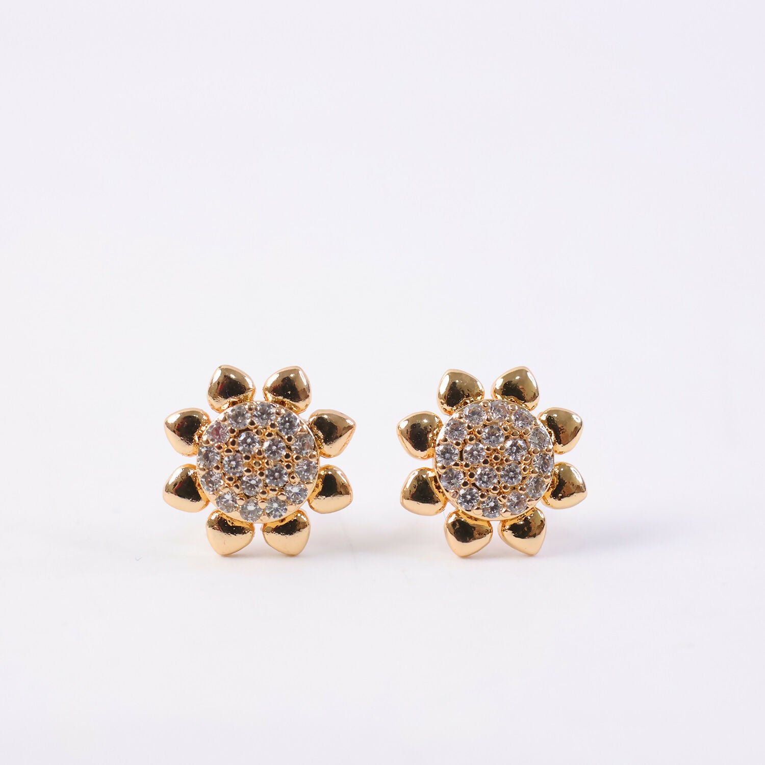 These elegant floral stud earrings feature a beautiful gold-tone finish with finely set CZ stones that create a sparkling flower design. The balanced shape and detailed stone arrangement give them a graceful yet eye-catching look. Designed for comfort and everyday wear, they pair effortlessly with casual outfits, ethnic wear, and party looks. The classic floral pattern makes them suitable for all age groups, from girls to women. A versatile jewellery choice that adds charm to daily styling and special occasions alike.
