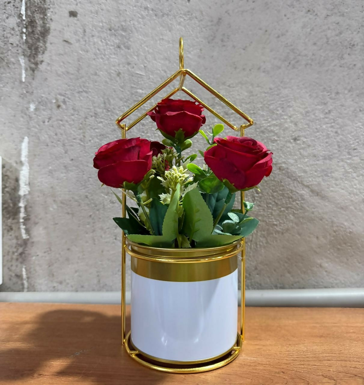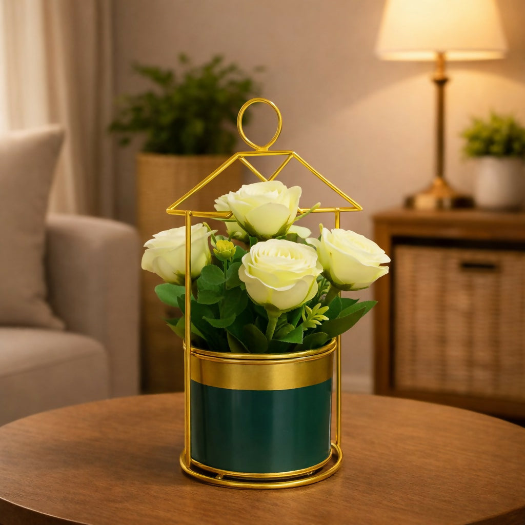 Enhance your home décor with this elegant gold geometric tabletop planter. Designed with a modern metal frame and a stylish cylindrical pot, this decorative piece adds a sophisticated touch to any space. The sleek structure beautifully complements floral arrangements, artificial plants, or small decorative setups, making it perfect for living rooms, bedrooms, offices, or special occasions.