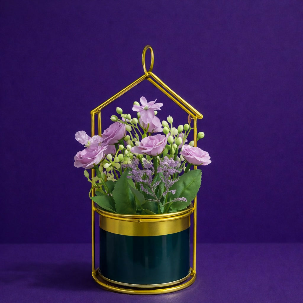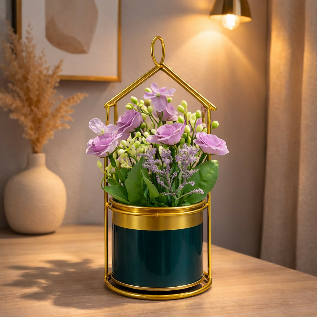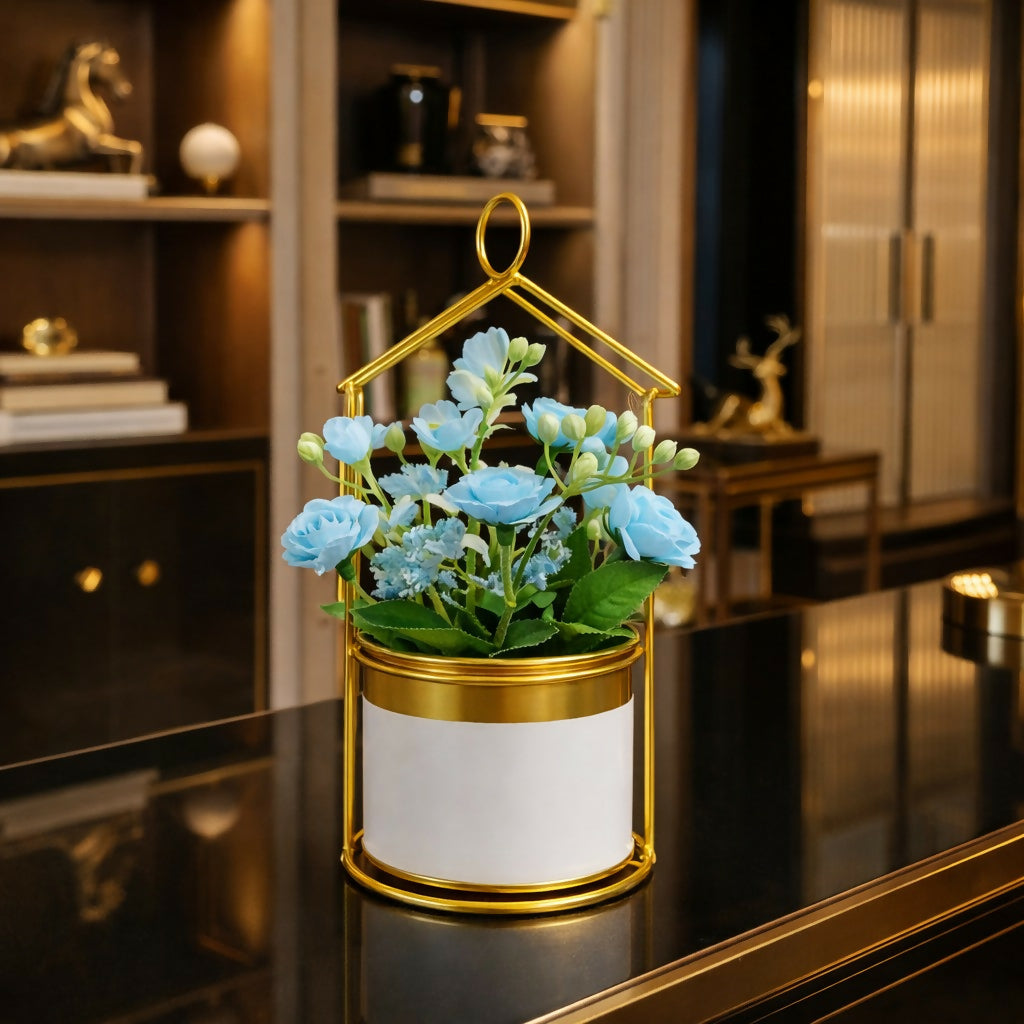 gold planter, house frame plant holder, tabletop flower pot, decorative metal planter, indoor plant decor, artificial flower holder, desk plant decor, modern home decor planter, office table decor, gift planter pot, small decorative pot, stylish plant stand
