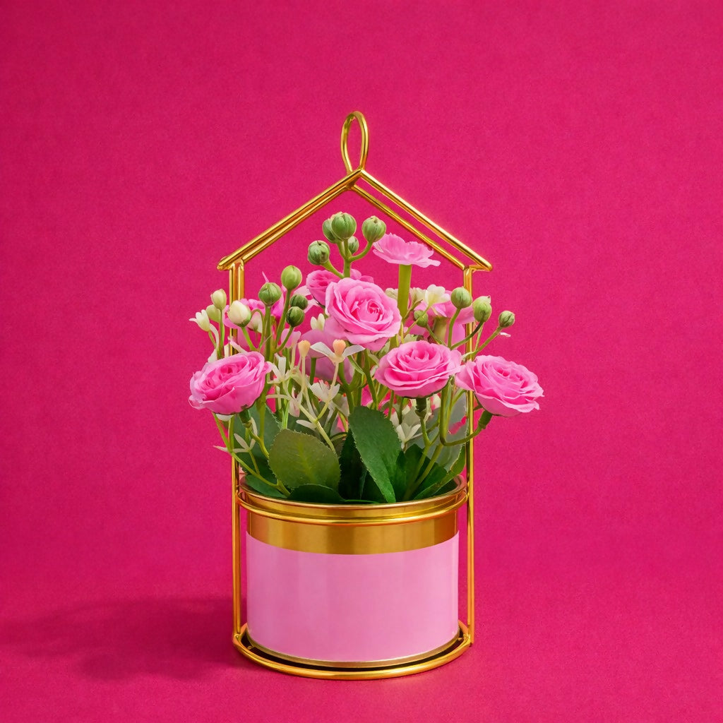 Add charm and elegance to your living space with this stylish gold house-frame tabletop planter. Designed with a modern metal structure shaped like a house and a sleek cylindrical pot, this decorative piece enhances any room with a warm and contemporary touch. Perfect for artificial flowers, small plants, or decorative arrangements, it creates a beautiful focal point on tables, shelves, or desks.