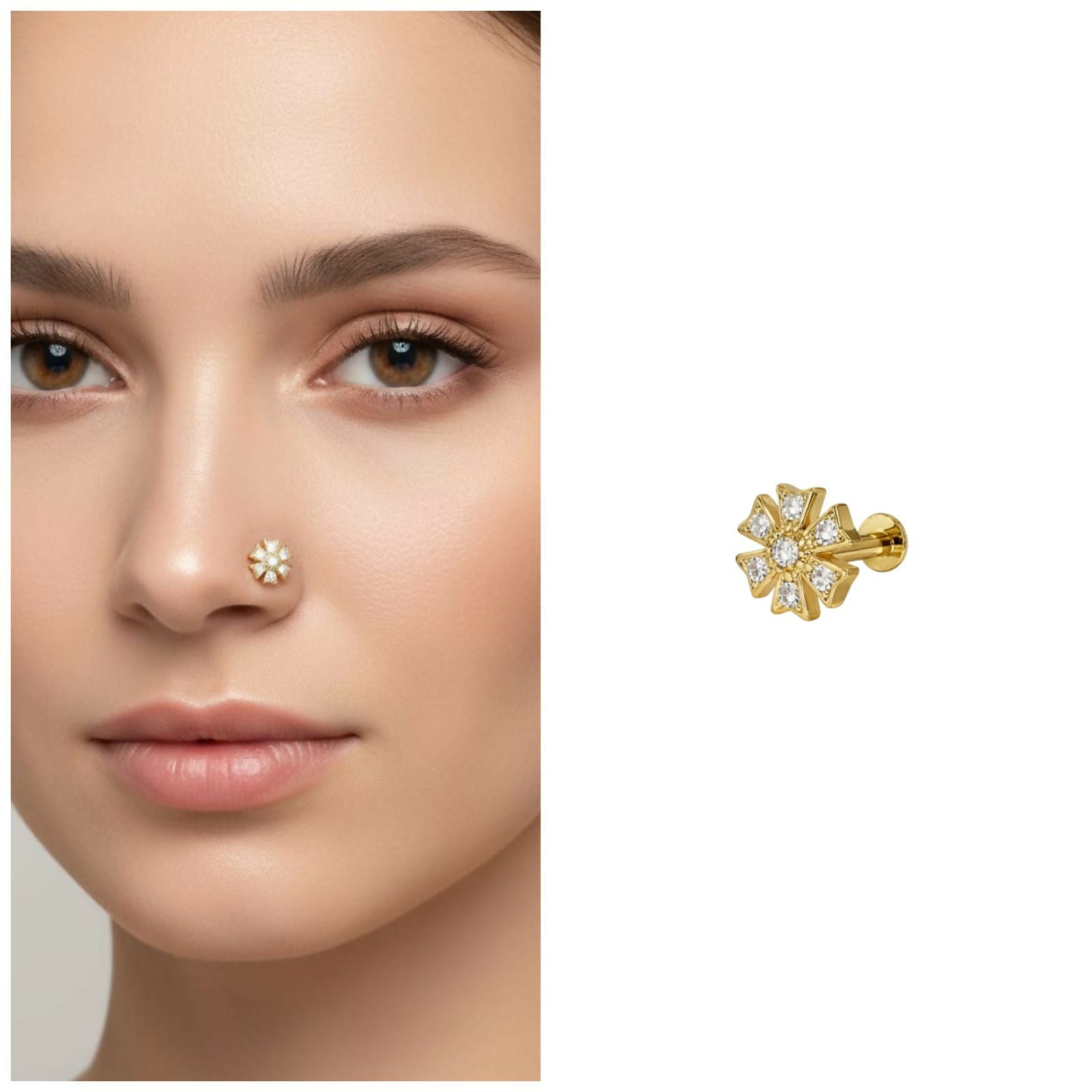 Elevate your everyday look with timeless elegance. This stunning floral-inspired nose pin is meticulously crafted to add a touch of sophisticated sparkle to your style. Featuring a classic seven-stone “Mukku Puda” design, it showcases a brilliant central stone surrounded by six shimmering accents, perfectly mimicking the beauty of a blooming flower.