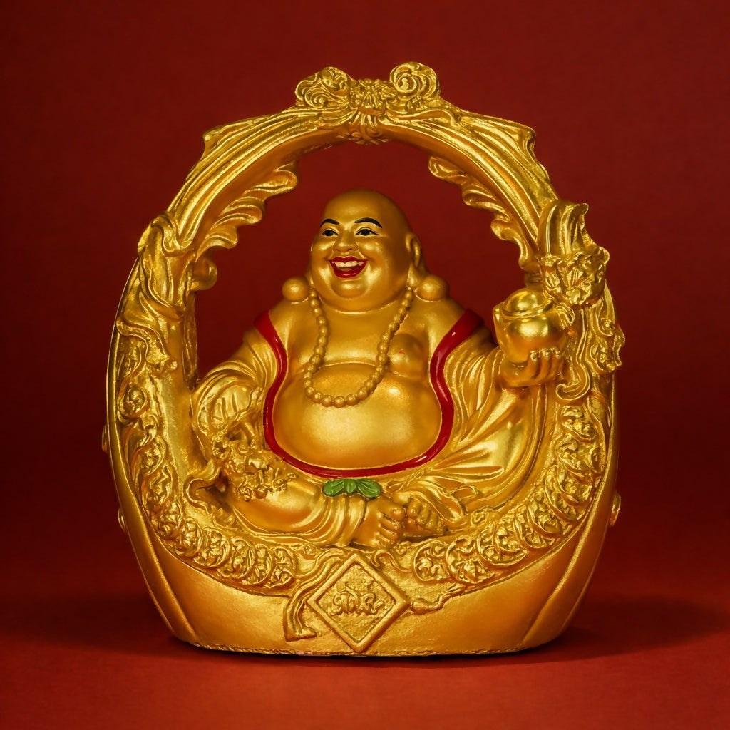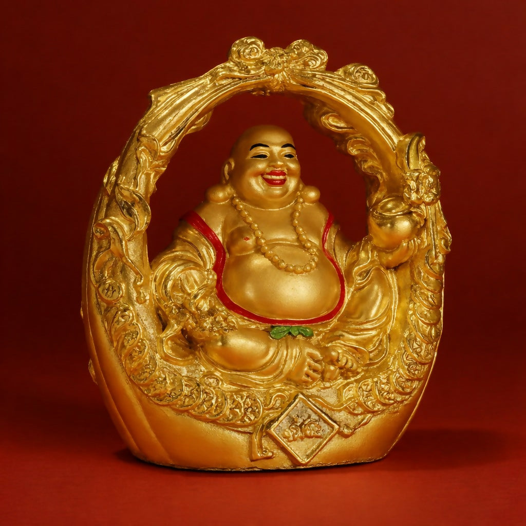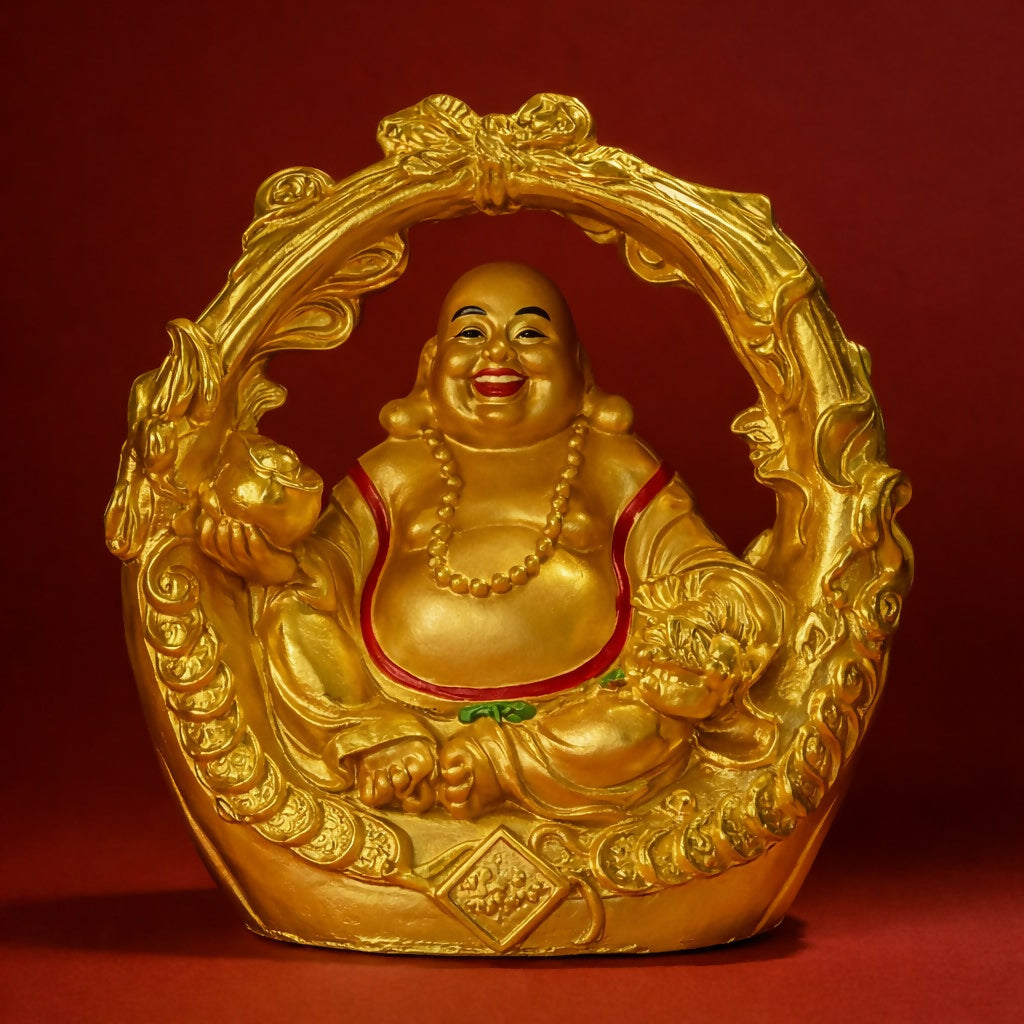 Enhance the positivity and elegance of your home or office with this beautiful Golden Laughing Buddha decorative statue. Designed with intricate detailing and a luxurious gold finish, this showpiece symbolizes happiness, prosperity, and good fortune. The cheerful Laughing Buddha seated within an ornate circular frame adds a spiritual and decorative touch to any space. Perfect for living rooms, offices, meditation areas, or entrance décor, this statue is believed to attract positive energy and abundance. It also makes a thoughtful gift for housewarmings, festivals, and special occasions.