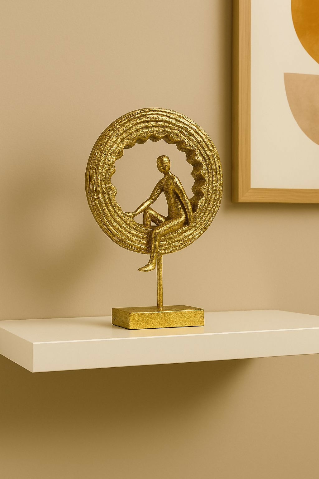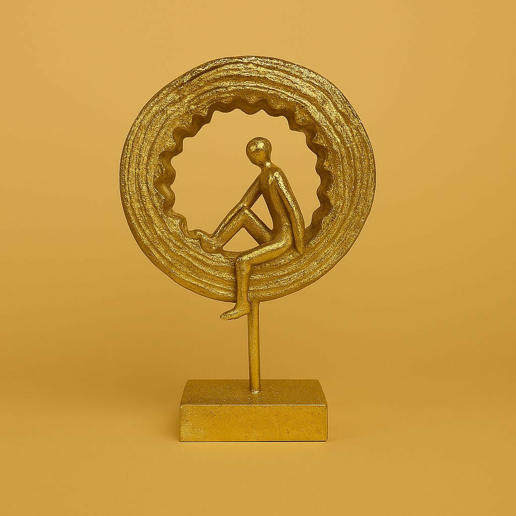 Enhance your living space with this elegant golden meditating yoga figurine sculpture. Designed with a modern circular ring backdrop and a peaceful meditation pose, this decorative showpiece symbolizes balance, mindfulness, and inner peace. Its artistic design adds a luxurious and calming touch to bedrooms, living rooms, offices, meditation corners, and shelves. The premium metallic finish and sturdy base make it a perfect centerpiece for modern home décor and a thoughtful gift for yoga lovers and spiritual décor enthusiasts.