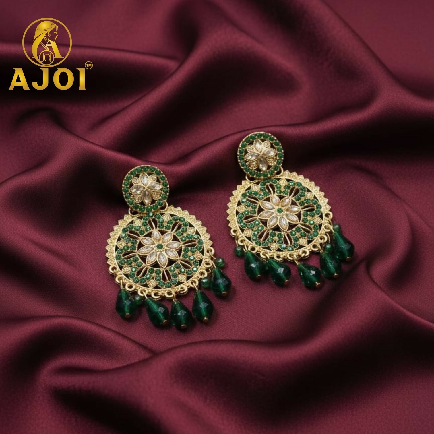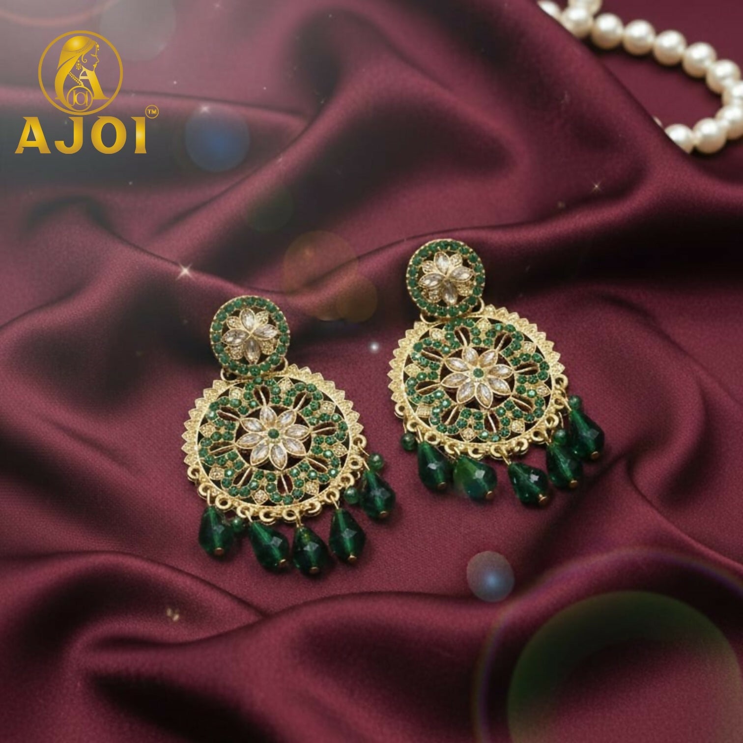 At the heart of the design lies a beautifully sculpted floral motif embellished with shimmering crystal stones, surrounded by meticulously set green beadwork that enhances depth and richness. The lower edge is elegantly finished with deep emerald translucent teardrop danglers, adding fluid movement and a majestic finishing touch.