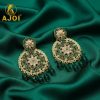 At the heart of the design lies a beautifully sculpted floral motif embellished with shimmering crystal stones, surrounded by meticulously set green beadwork that enhances depth and richness. The lower edge is elegantly finished with deep emerald translucent teardrop danglers, adding fluid movement and a majestic finishing touch.