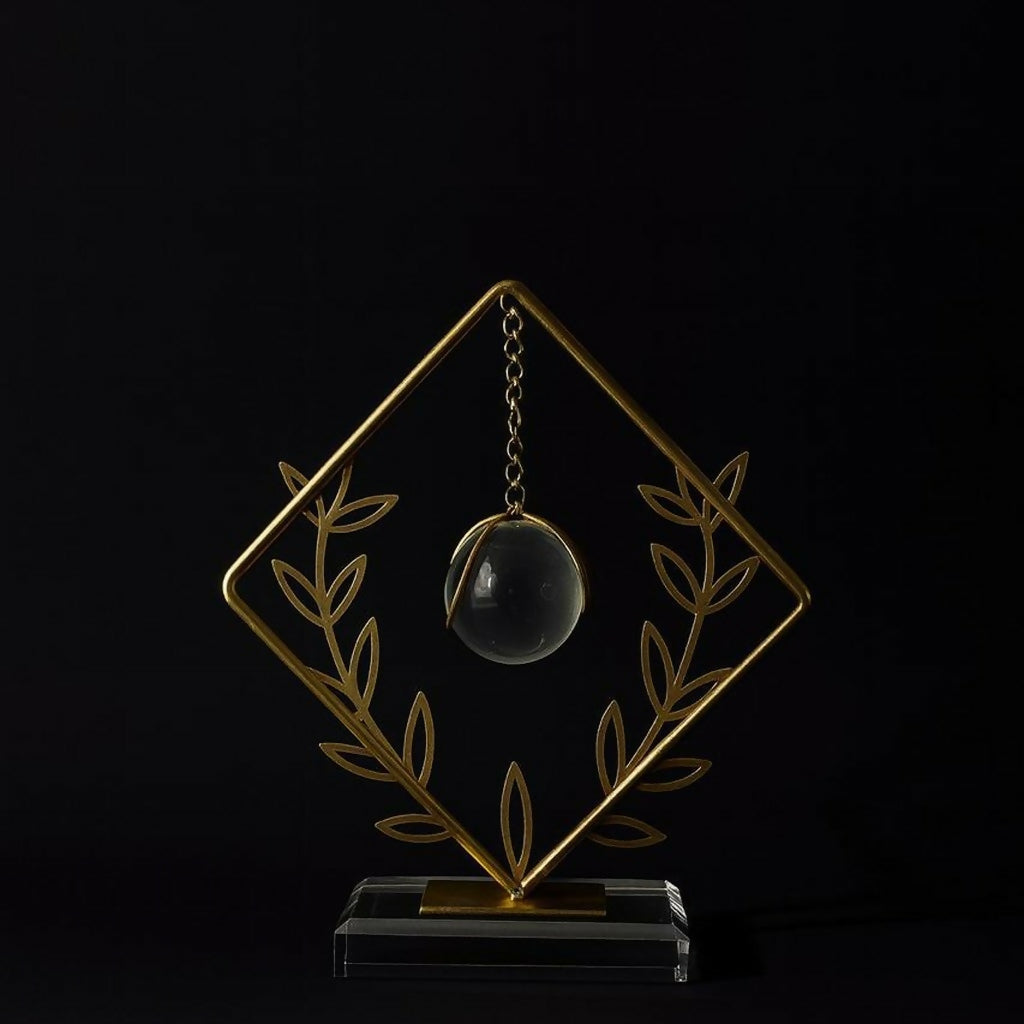 Add a touch of modern elegance to your home or office with this stylish crystal orb decorative showpiece. Designed with a sleek geometric metal frame and delicate leaf patterns, this décor piece features a suspended crystal sphere that creates a unique and eye-catching visual effect. The golden metal structure paired with a clear crystal ball and sturdy base gives it a luxurious and contemporary appearance. Perfect for decorating living rooms, office desks, shelves, or center tables, this artistic sculpture enhances the aesthetic appeal of any interior space. It also makes a wonderful gift for housewarmings, weddings, and special occasions.