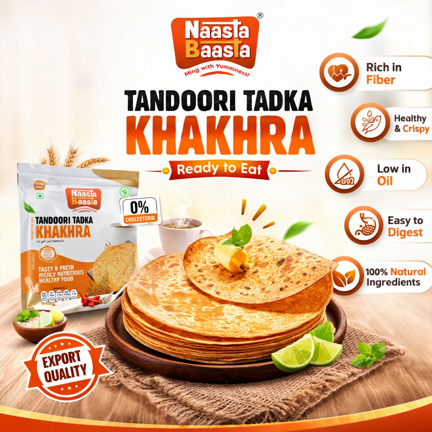 • Naasta Baasta Tandoori Tadka Khakhra is rich in fiber and designed to be light and easy to digest for regular consumption