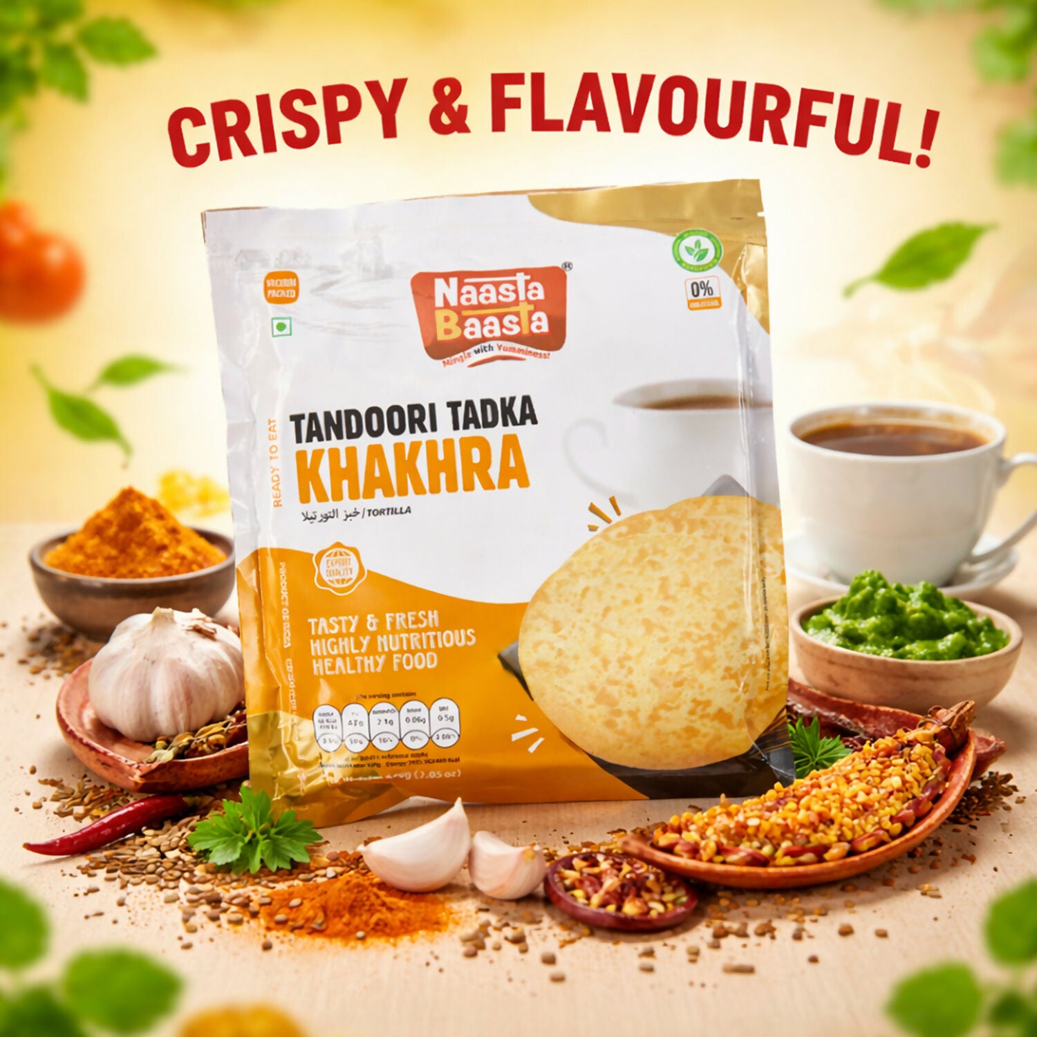 • Naasta Baasta Tandoori Tadka Khakhra pairs perfectly with tea, coffee, chutney, or dips for a complete snack experience