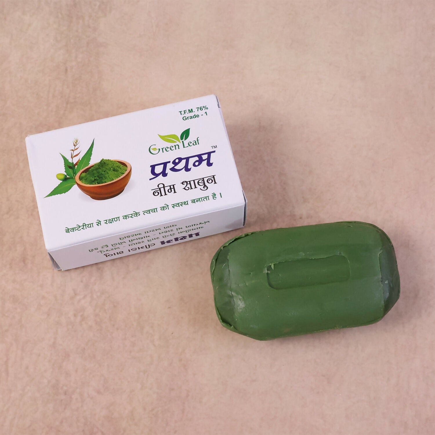 Green Leaf Prathem Neem Soap is a herbal bathing bar enriched with the natural goodness of neem to help cleanse and protect your skin. Formulated to support antibacterial care, it helps remove impurities, excess oil, and dirt while keeping the skin fresh and healthy. The rich lather gently cleanses the body and face without causing dryness. Ideal for daily use, this neem soap promotes clear-looking skin and a refreshed feel after every wash. Suitable for all skin types and perfect for maintaining everyday hygiene.