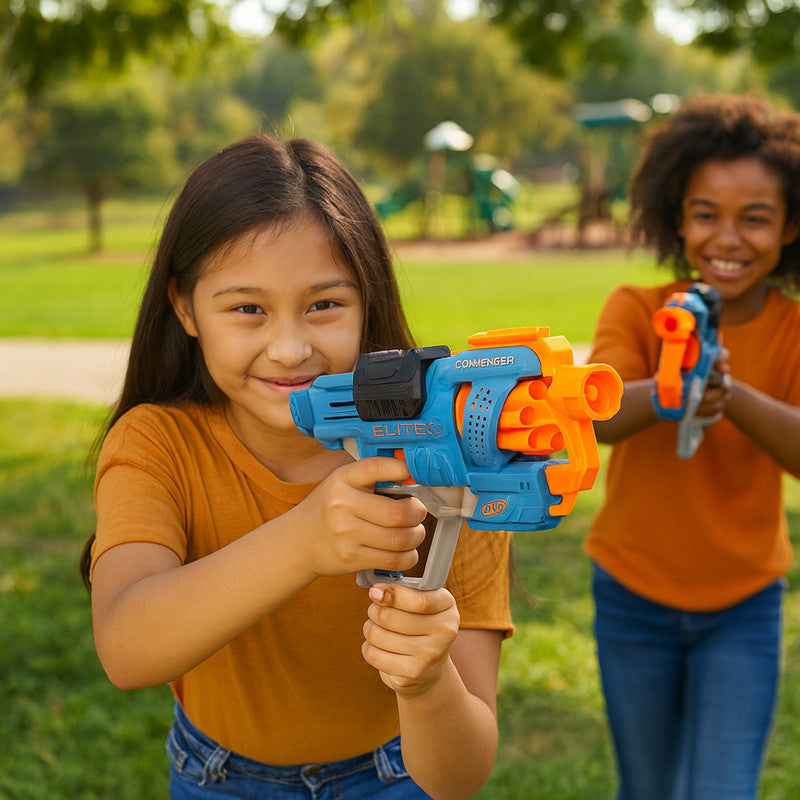 The Nerf Elite 2.0 Commander Blaster is designed for action-packed battles with precision, power, and fun. This blaster includes 12 foam darts and features a rotating barrel for multiple shots, making it perfect for quick-fire missions. Its lightweight and ergonomic design ensures comfortable handling, while the tactical rail attachments allow for customization during play. Built for both indoor and outdoor excitement, this blaster encourages active play, team battles, and imaginative role-play scenarios.