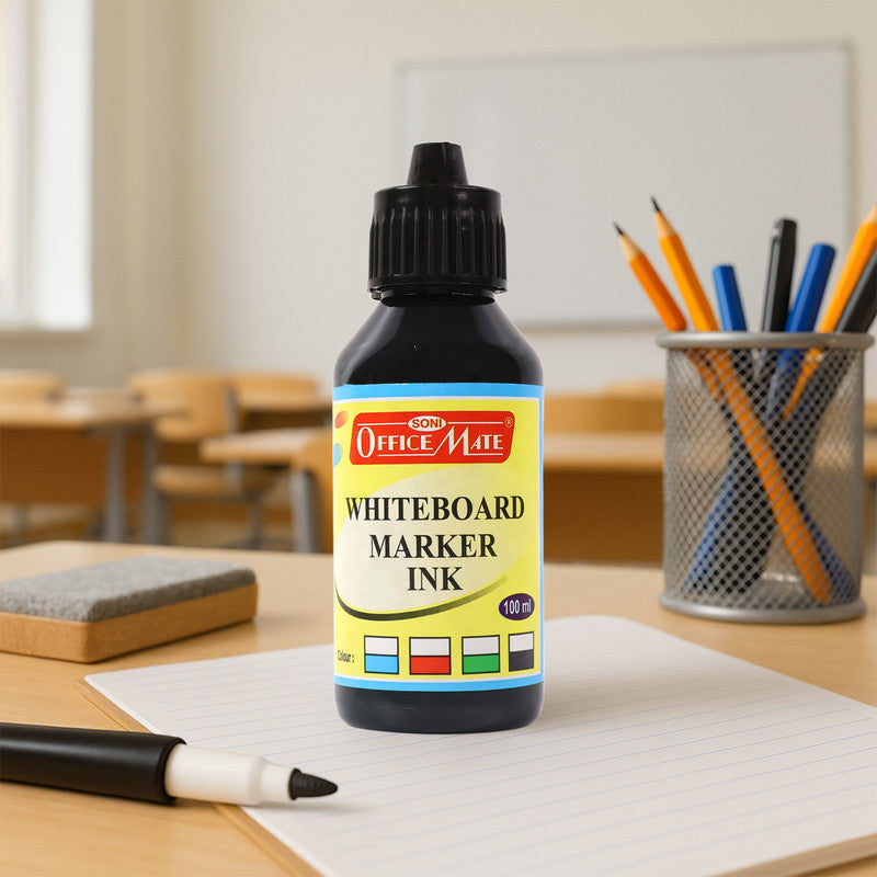 Soni Officemate Whiteboard Marker Ink is specially formulated to deliver bright, clear, and consistent writing on all types of whiteboards. This 100ml refill bottle ensures long-term use and helps you save money by easily refilling your existing markers. The quick-drying ink prevents smudging and provides easy erasability without leaving stains. Suitable for offices, schools, coaching institutes, and home use, it ensures effortless writing and clean erasing every time. Available in multiple vibrant colors, this ink keeps your presentations and lessons clear and professional-looking.