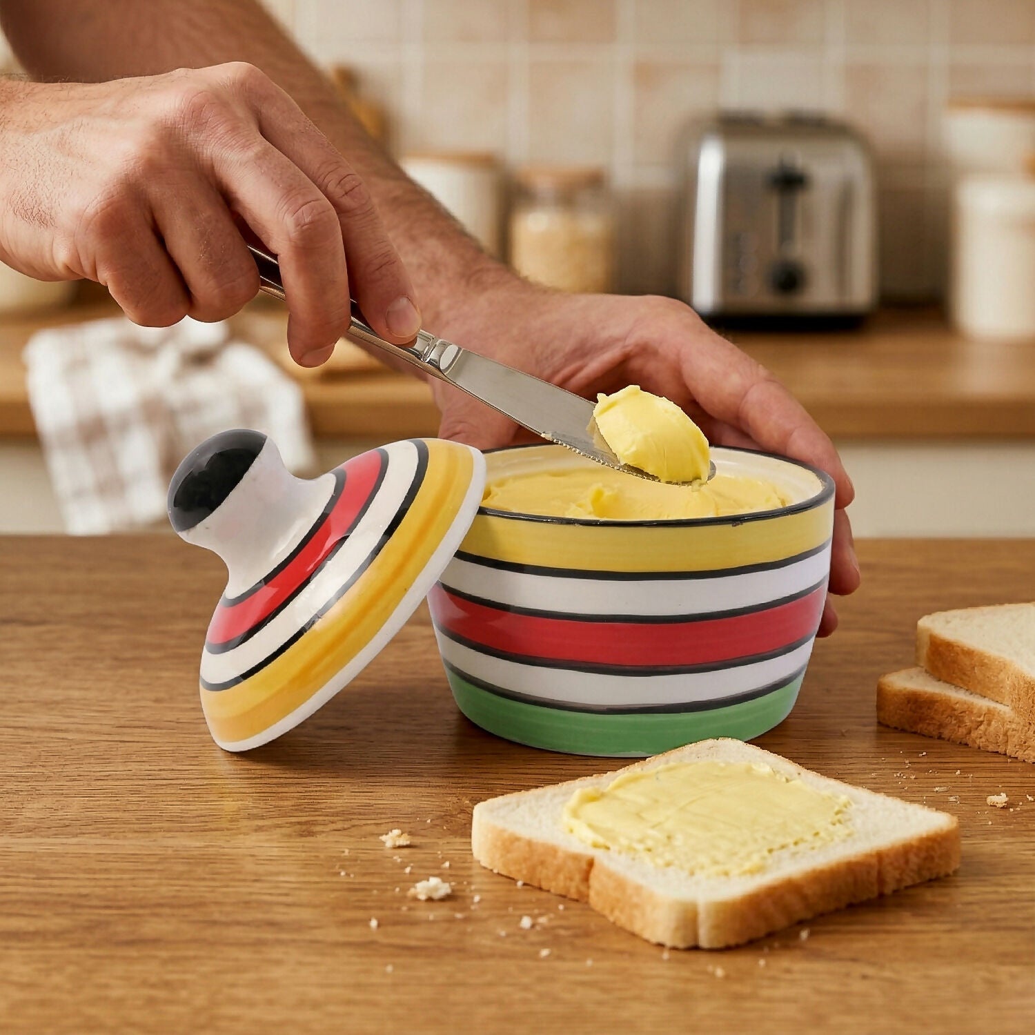 Premium Stoneware Material: Ye butter pot mazboot aur high-quality ceramic (stoneware) se bana hai, jo lambe samay tak chalta hai.