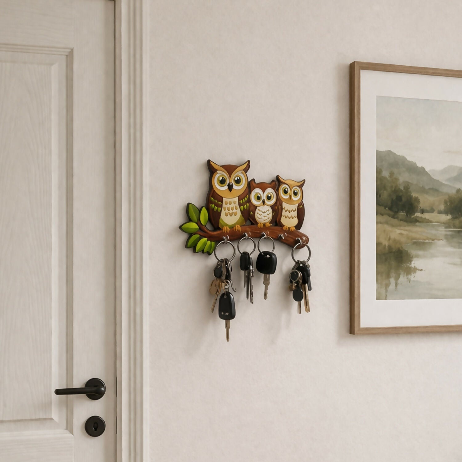 Owl Design Wooden Key Holder for Wall | 5 Hook Decorative Key Stand