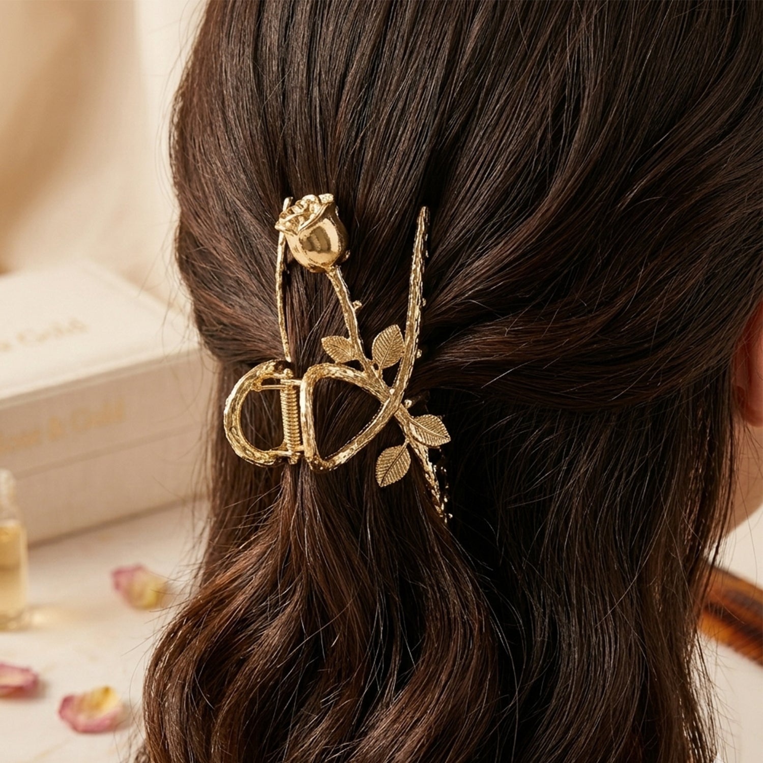 Add a luxurious touch to your hairstyle with this beautifully crafted gold rose design hair claw clip. Inspired by the elegance of a blooming rose, this clip features a unique long stem floral design that enhances your overall look. Its sturdy grip ensures your hair stays securely in place while providing comfort throughout the day. Perfect for both casual styling and special occasions, this stylish accessory elevates your fashion effortlessly. A must-have piece for those who love elegant and timeless hair accessories.