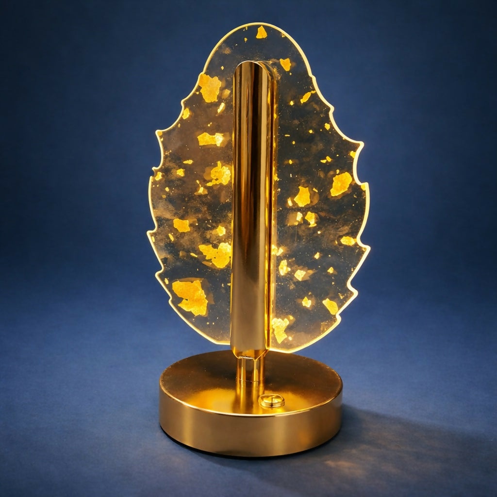 Bring elegance and warmth to your space with this beautifully designed leaf-shaped crystal table lamp. Featuring a sleek gold finish base and a uniquely crafted glowing leaf panel, this lamp creates a soothing ambient light that enhances any room décor. Perfect for bedside tables, living rooms, or office desks, it adds a modern yet artistic touch while delivering soft illumination. Ideal for gifting or elevating your home décor with a stylish lighting accent.