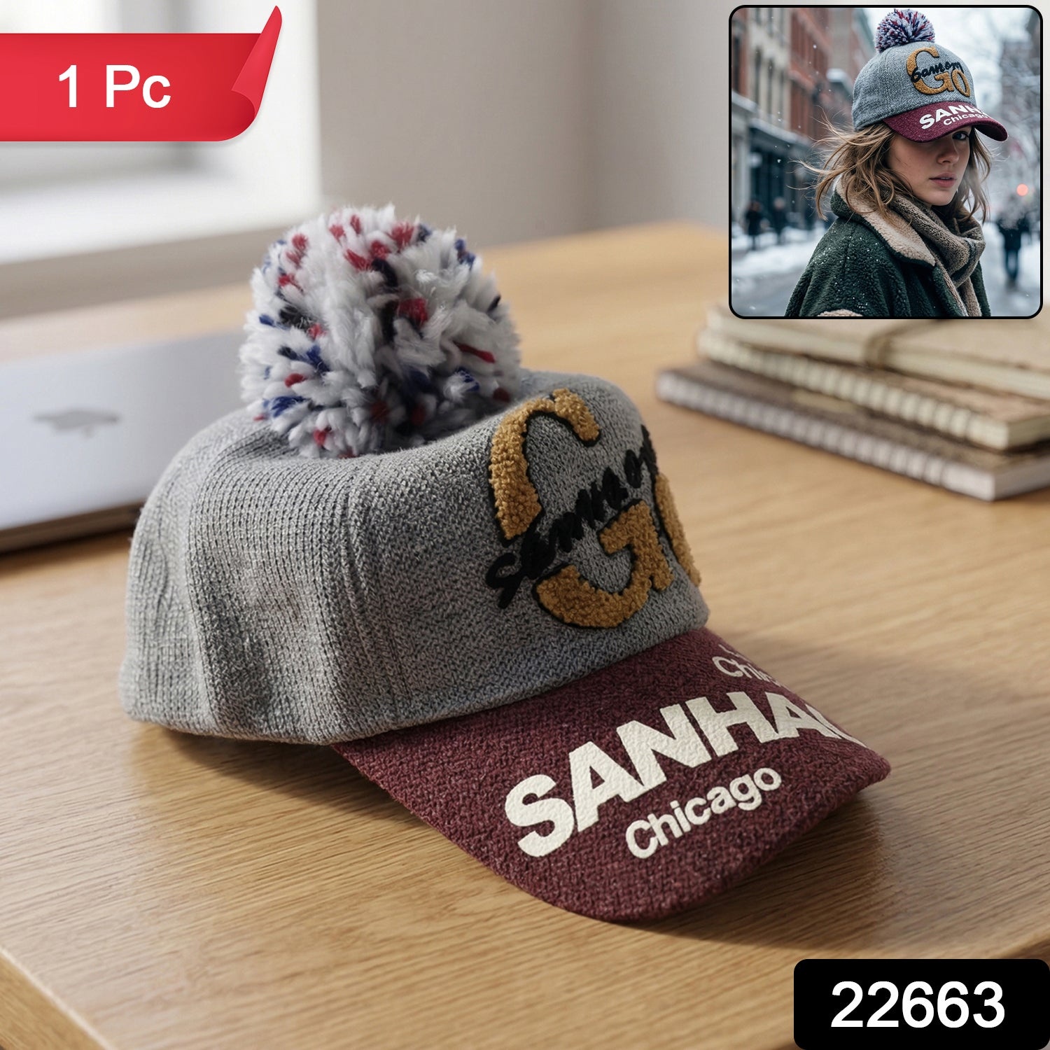Trendy Winter Baseball Style Woolen Cap with Pom Pom for Women 1 Pc – Warm Knit Cold Weather Cap with Stylish Letter Design and Cozy Fit Outdoor Fashion Hat