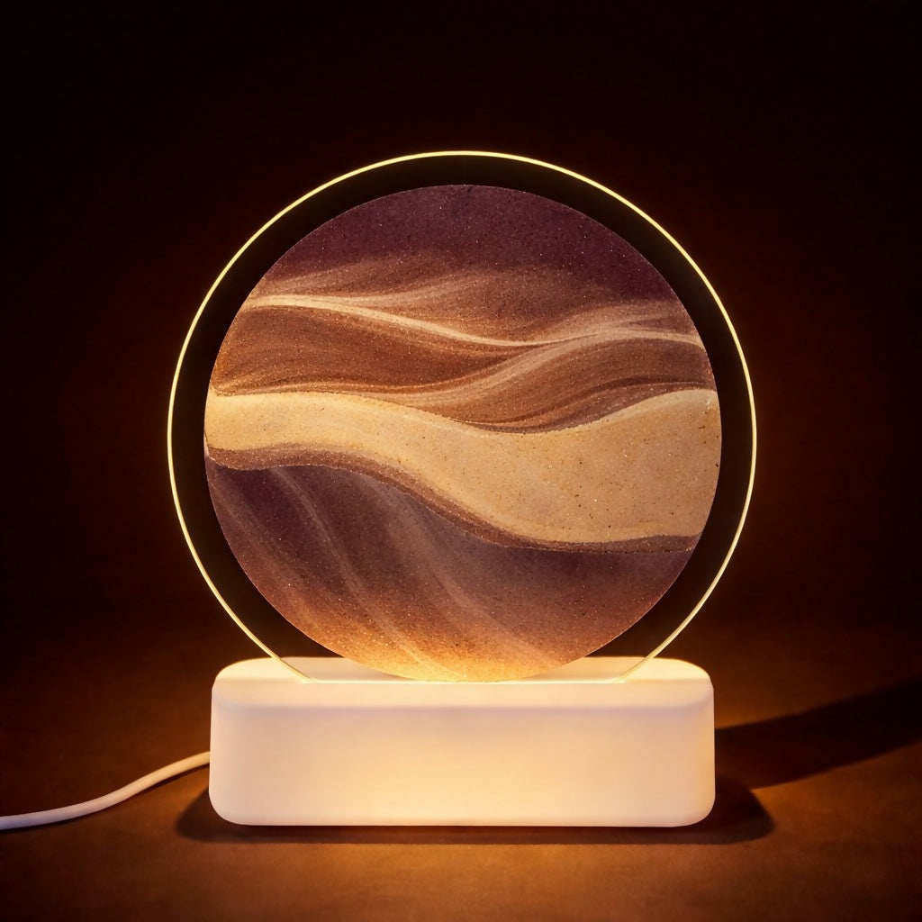 Enhance your space with this stunning moving sand art LED lamp that creates beautiful, ever-changing patterns. The circular acrylic design allows the sand to flow smoothly, forming unique landscape effects every time it is flipped. The warm LED lighting highlights the layered sand design, creating a cozy and relaxing atmosphere. Perfect for bedrooms, offices, or living rooms, this lamp is both a decorative showpiece and a calming visual experience.