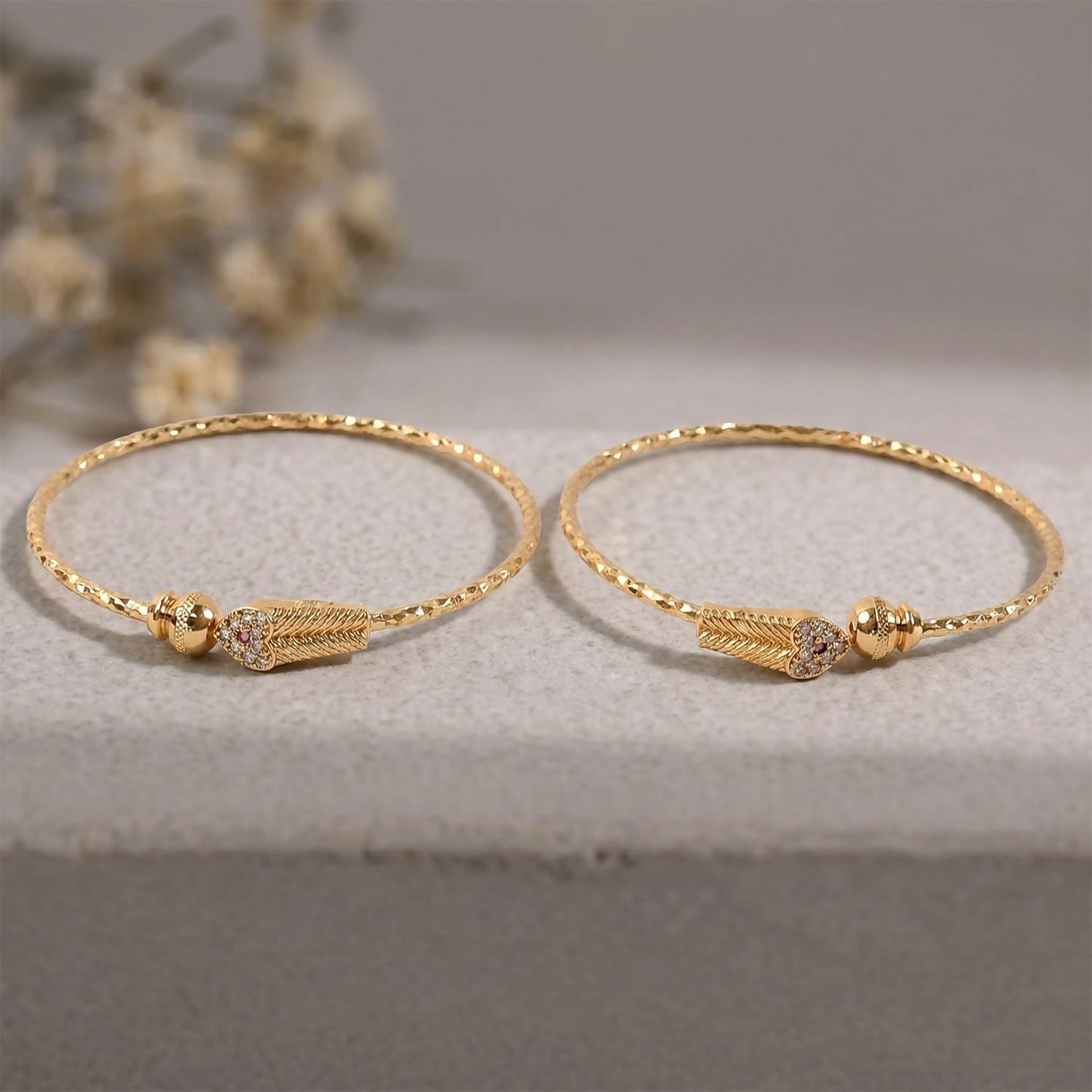 Add a touch of elegance to your jewelry collection with this beautifully crafted gold plated leaf design kada bracelet pair. Featuring a finely textured band with a delicate leaf motif and sparkling stone accents, these bangles offer a perfect blend of sophistication and modern charm. The stylish openable design ensures easy wear while providing a secure and comfortable fit.