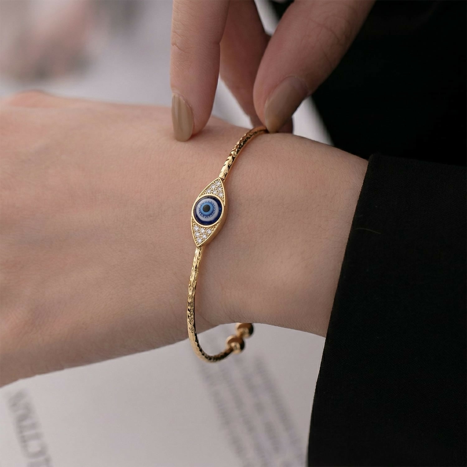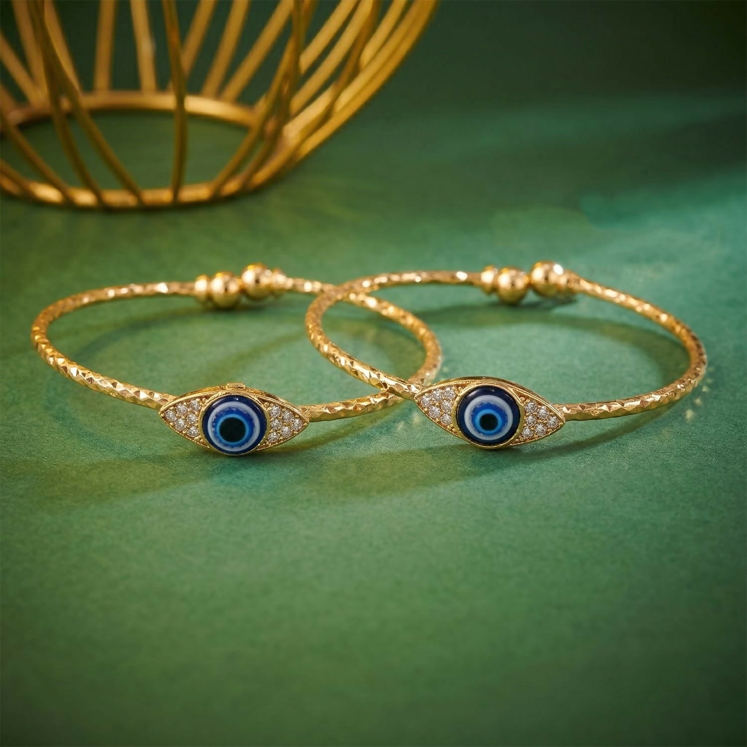 Enhance your style with these elegant gold evil eye bangles, designed to offer both beauty and protection. Featuring a striking blue evil eye centerpiece surrounded by sparkling stones, these bangles symbolize positivity and ward off negative energy.