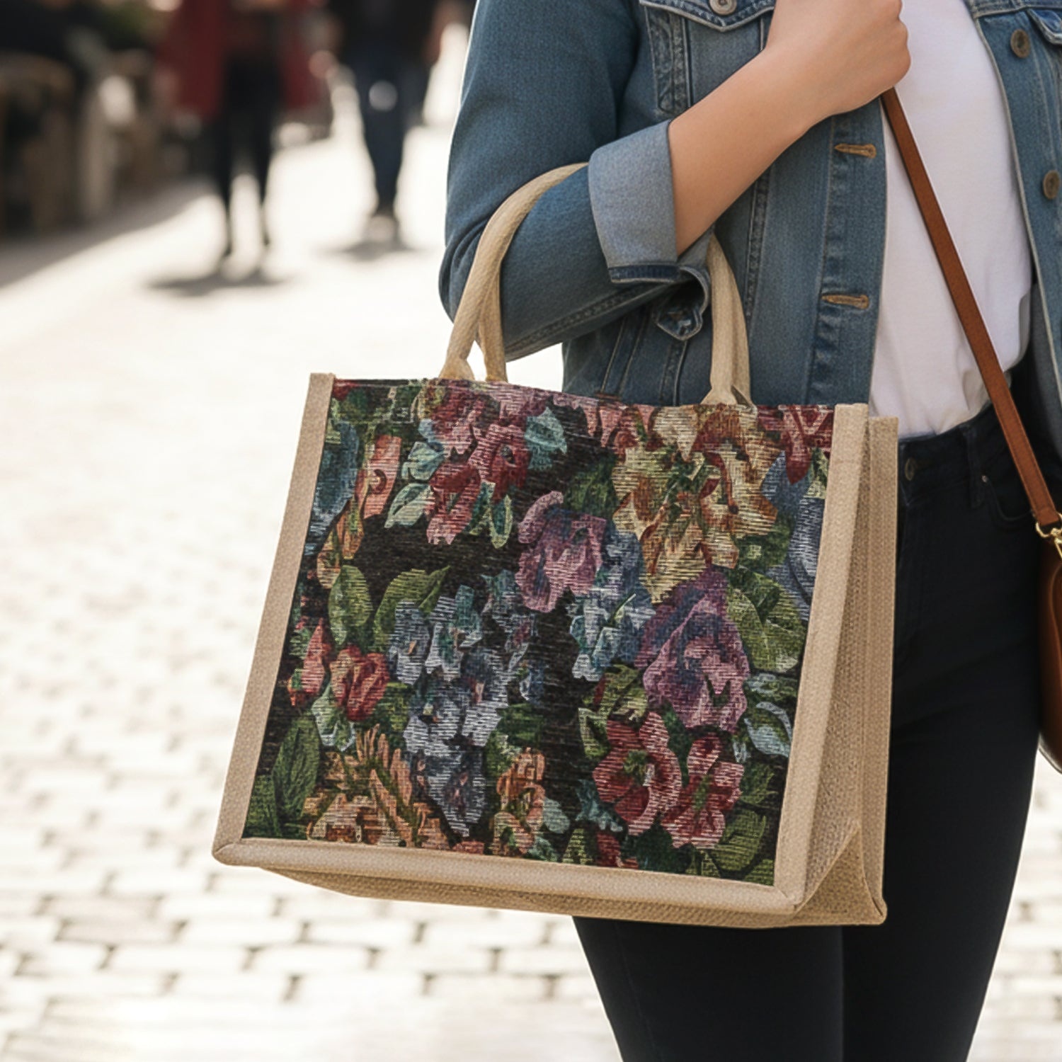 Multipurpose Floral Print Carry Hand Bag 1 Pc 29x33 Cm – Reusable Jute Style Shopping Tote Bag Durable Eco Friendly Grocery Office Travel Handbag
