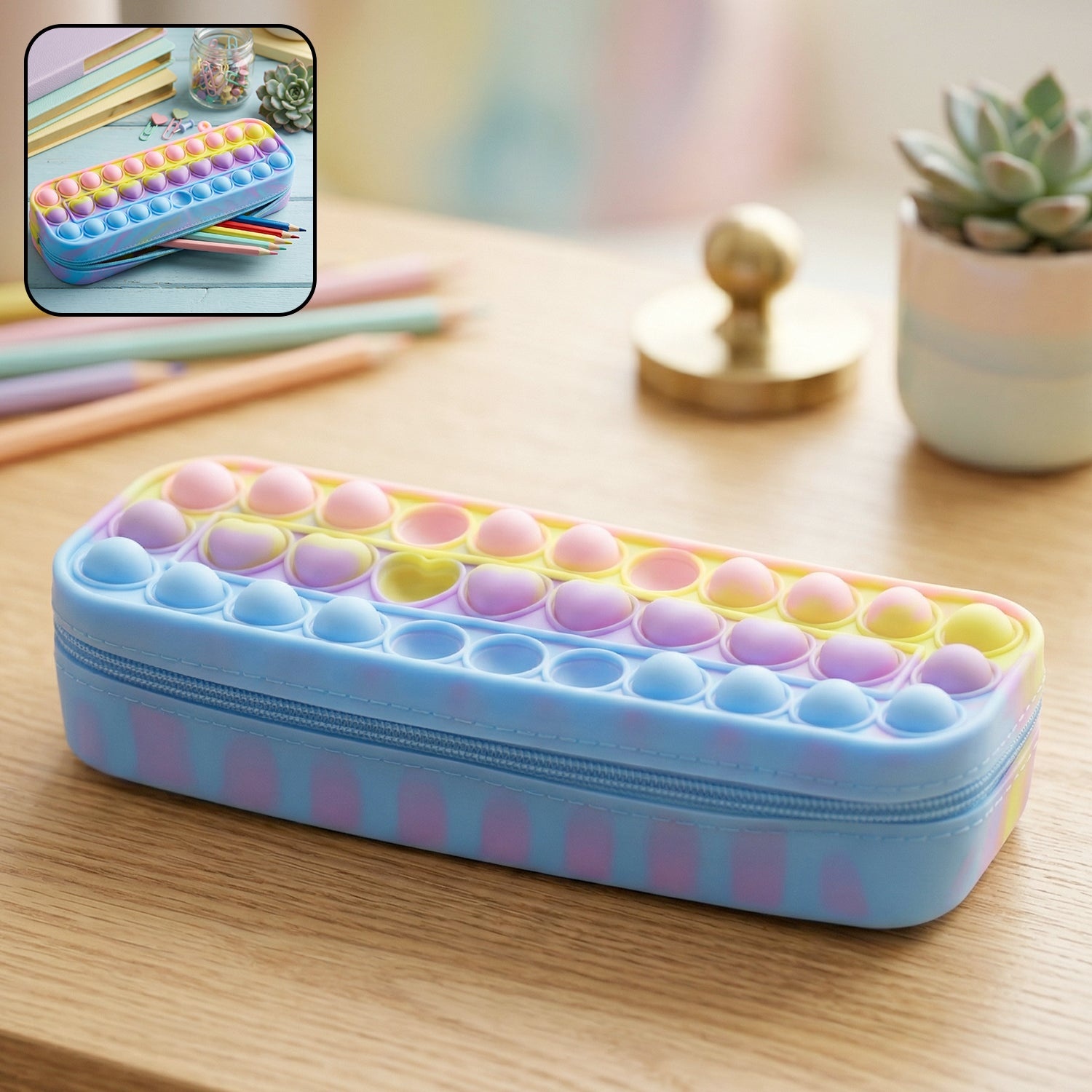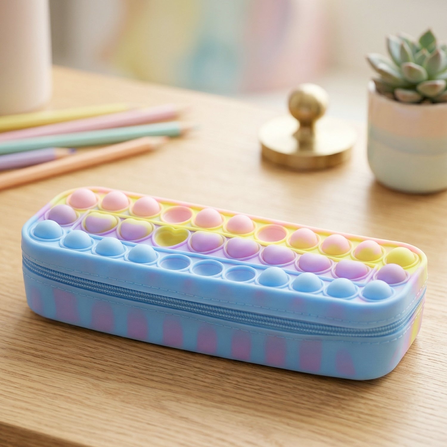 Make school time more fun and organized with this unique pop-it pencil pouch that combines storage with a playful fidget design. Featuring a soft bubble surface, it provides a satisfying pressing experience while helping reduce stress and boredom. The spacious compartment easily holds pens, pencils, and other stationery items, keeping everything neatly arranged. Designed for daily use, it is both practical and entertaining, making it a favorite among kids. Its compact and portable structure makes it perfect for carrying in school bags or using at home.