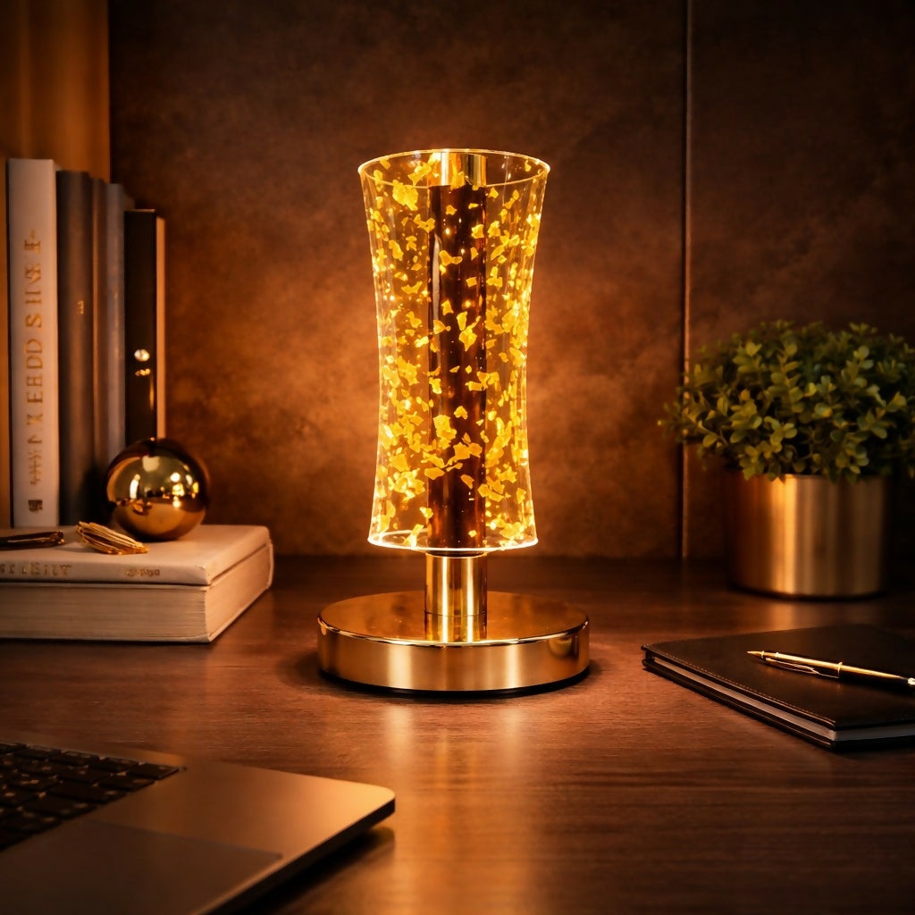 Add a touch of luxury to your space with this crystal glow LED table lamp. Featuring a stunning transparent shade with glowing crystal-like flakes and a premium gold base, this lamp creates a warm and mesmerizing ambiance. Perfect for bedrooms, living rooms, or work desks, it enhances both lighting and decor. Its modern design makes it an eye-catching centerpiece and a great gifting option.