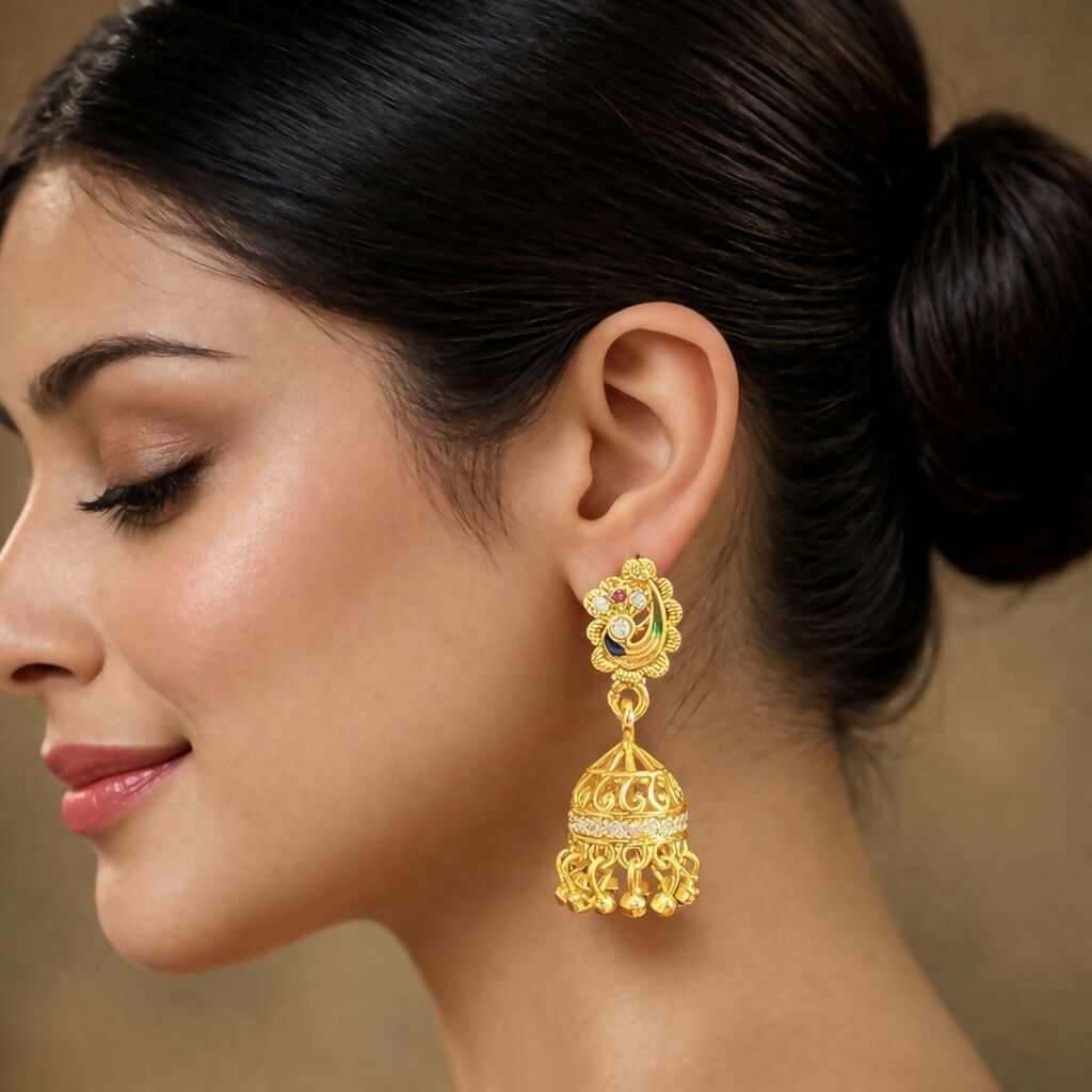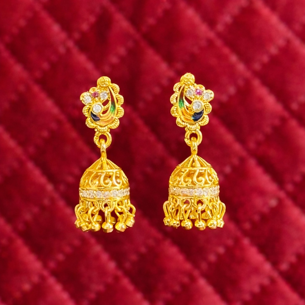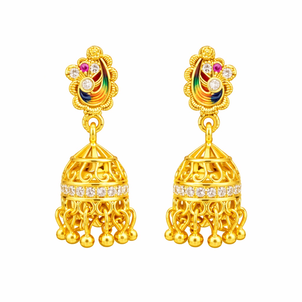 Turn every moment into a statement of elegance with these beautifully crafted gold jhumka earrings, designed to reflect timeless charm and cultural richness. The upper design features a graceful, artistic motif with vibrant enamel accents that bring a unique pop of color, perfectly complementing the rich gold finish. Subtle stone detailing adds a refined sparkle, enhancing the overall sophistication without overwhelming the intricate design.
