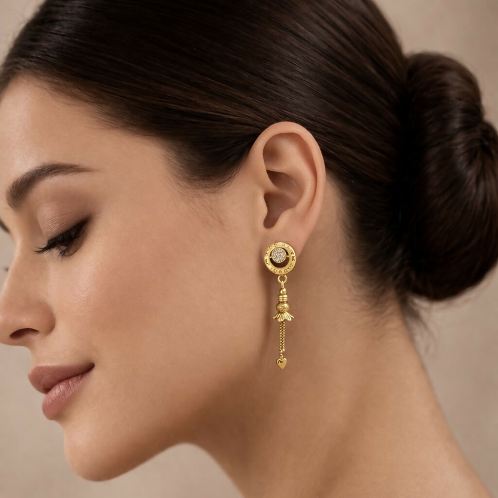 These exquisitely designed gold dangle earrings bring together elegance, craftsmanship, and modern sophistication in a beautifully balanced form, featuring a sleek teardrop-shaped top that is delicately accented with a sparkling stone centerpiece, adding a subtle yet captivating brilliance that catches the light from every angle; the smooth, high-polish gold finish enhances the richness of the design, giving it a luxurious and refined appearance, while the finely detailed hanging elements below create gentle movement and a graceful flow, adding depth and charm to the overall look; thoughtfully crafted to be lightweight and comfortable, these earrings are ideal for long hours of wear without any discomfort, and the secure stud backing ensures a firm and reliable fit throughout the day; their versatile design makes them a perfect match for a wide range of styles, effortlessly complementing traditional outfits such as sarees, lehengas, and festive attire, while also pairing beautifully with contemporary and western wear for a more modern, elegant touch; whether worn for weddings, parties, celebrations, or everyday occasions, these earrings add a refined sparkle and timeless appeal, making them a must-have addition to any jewelry collection and a wonderful gifting choice that reflects style, quality, and enduring beauty.