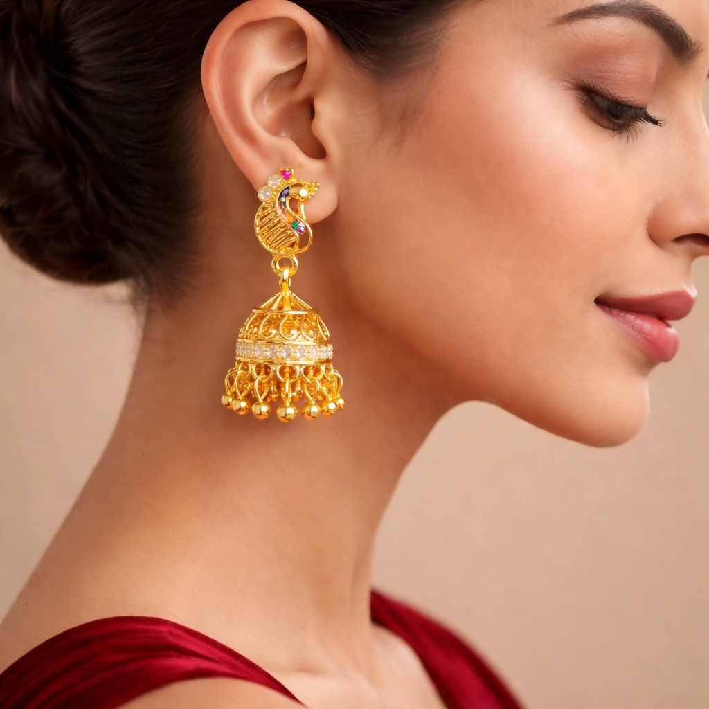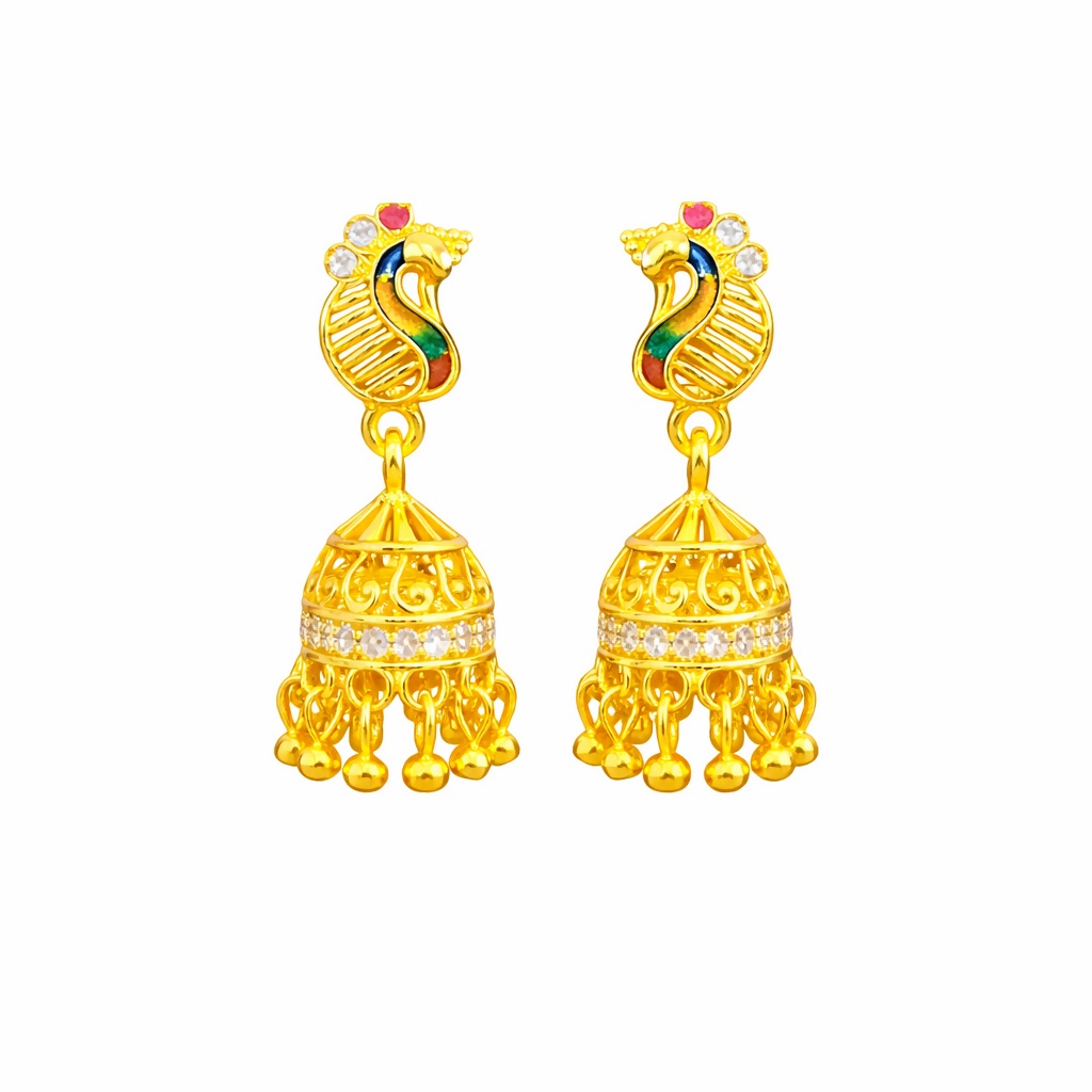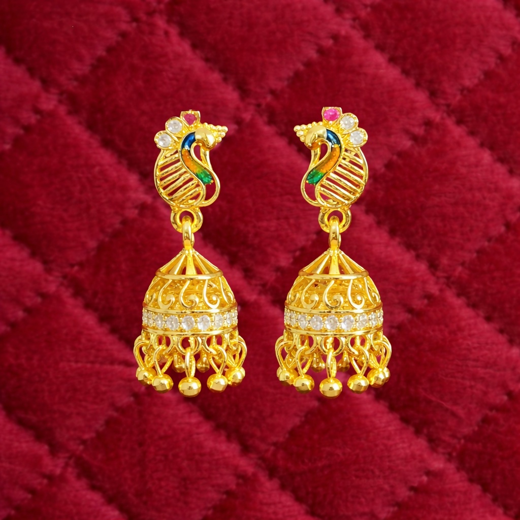 Elevate your jewelry collection with these exquisitely crafted peacock-inspired gold jhumka earrings, a perfect blend of traditional artistry and modern elegance. The top features a beautifully detailed peacock motif, symbolizing grace and beauty, highlighted with vibrant enamel accents in rich hues of green, red, and black that bring the design to life. The delicate stone embellishments add a subtle sparkle, enhancing the luxurious appeal without overpowering the intricate craftsmanship. Suspended below is a classic dome-shaped jhumka, meticulously designed with fine filigree patterns and a shimmering band of stones encircling the center, creating a radiant contrast against the polished gold finish. The dangling gold beads at the base add graceful movement and a soft rhythmic charm with every step. Lightweight yet statement-making, these earrings are designed for all-day comfort, making them ideal for festive occasions, weddings, cultural celebrations, or even to elevate your everyday ethnic look. Their timeless design ensures they pair effortlessly with sarees, lehengas, salwar suits, or fusion outfits, making them a versatile addition to any jewelry collection. Crafted with precision and attention to detail, these earrings are not just accessories but a celebration of heritage, elegance, and refined style.