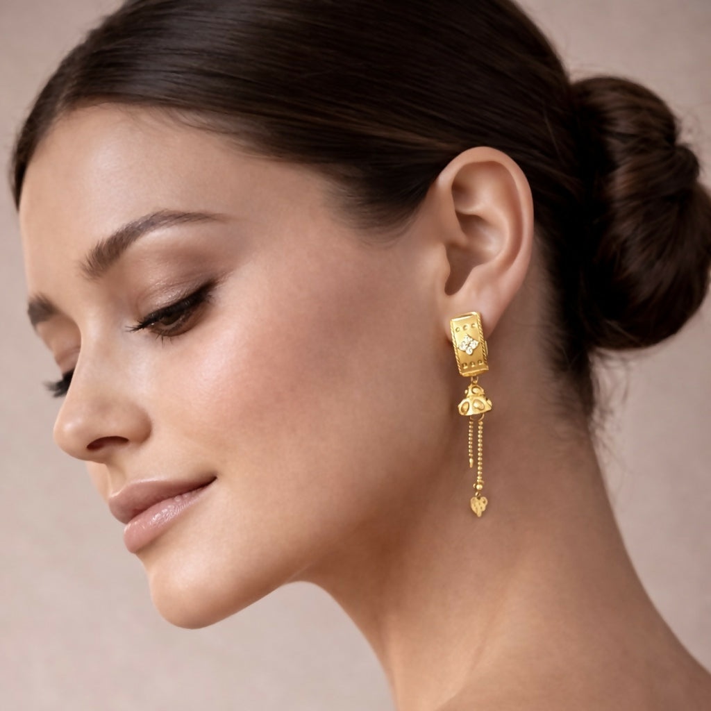 Gracefully designed with a classic appeal, these gold dangle earrings showcase a sleek teardrop-shaped top embellished with a shimmering stone that catches the light beautifully, complemented by finely detailed dangling elements that create soft movement and an elegant flow; crafted with a high-polish gold finish, they offer a rich and luxurious look while remaining lightweight and comfortable for all-day wear; the secure stud backing ensures a firm and easy fit, making them practical as well as stylish; perfect for enhancing both traditional and contemporary outfits, these earrings are ideal for festive celebrations, special occasions, or adding a touch of sophistication to everyday looks, making them a versatile and timeless addition to any jewelry collection.